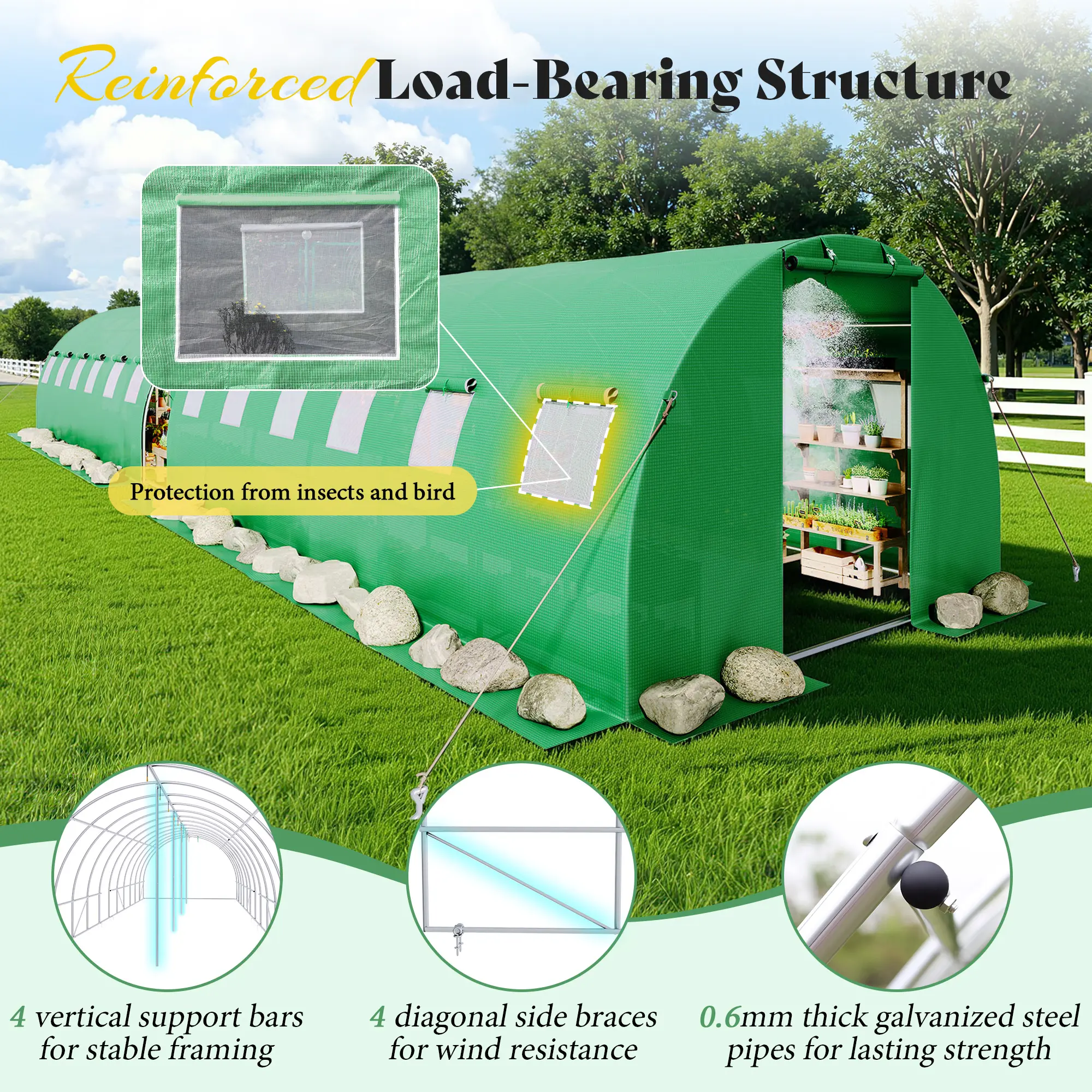 ·Reinforced Galvanized Steel Frame: A 0.6mm galvanized steel frame with 4 vertical posts and 4 diagonal braces boosts stability. With spiral stakes and tension ropes, this heavy duty greenhouse resists wind, rain, and corrosion