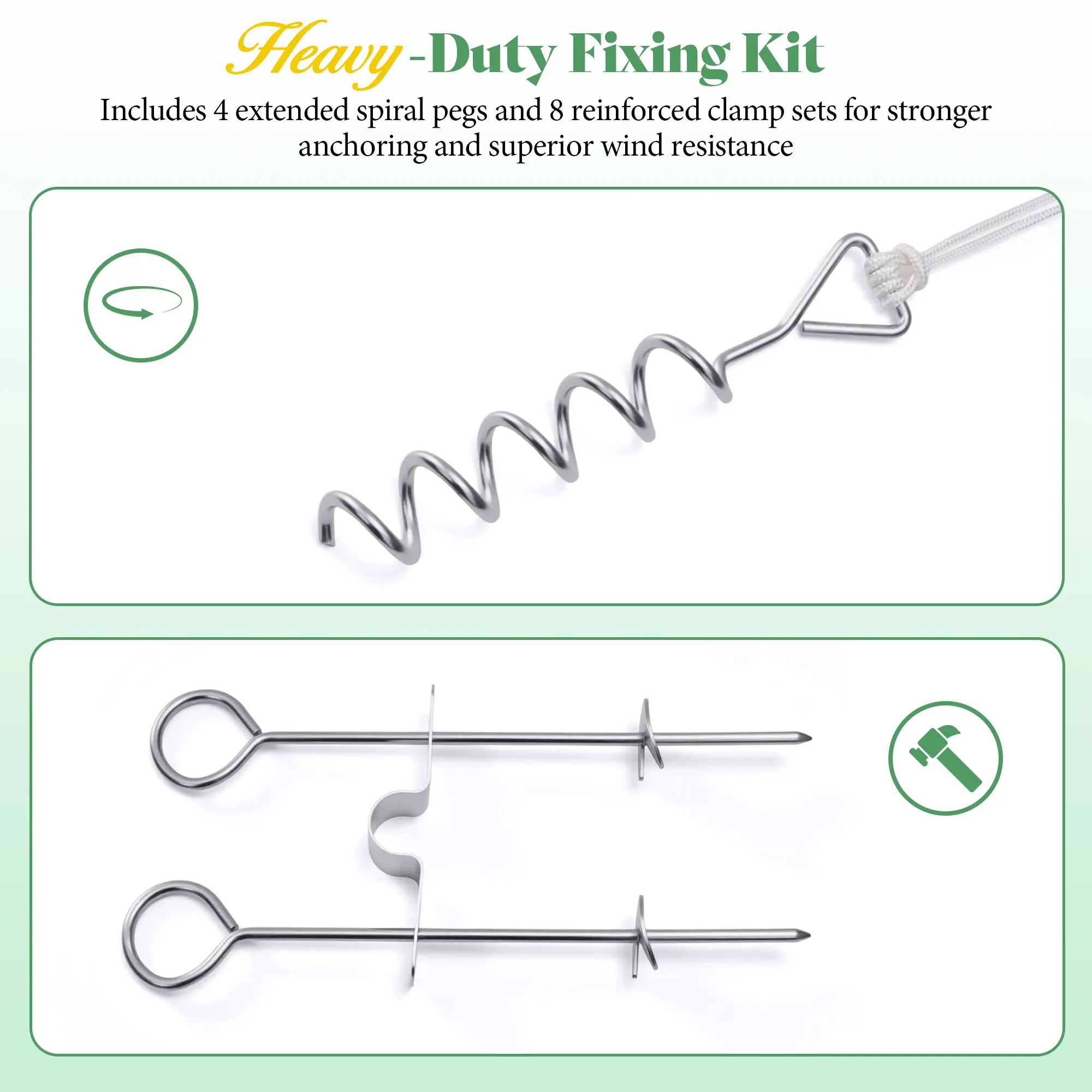·Secure & Stable Design: Spiral stakes, ropes, and clamps provide firm anchoring. The 30cm widened edges boost wind resistance, while capped pipe ends prevent rust—keeping this greenhouse kit stable and safe over time