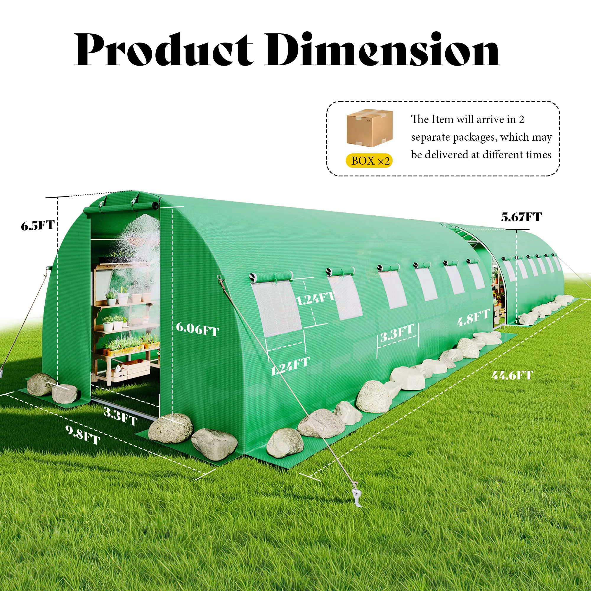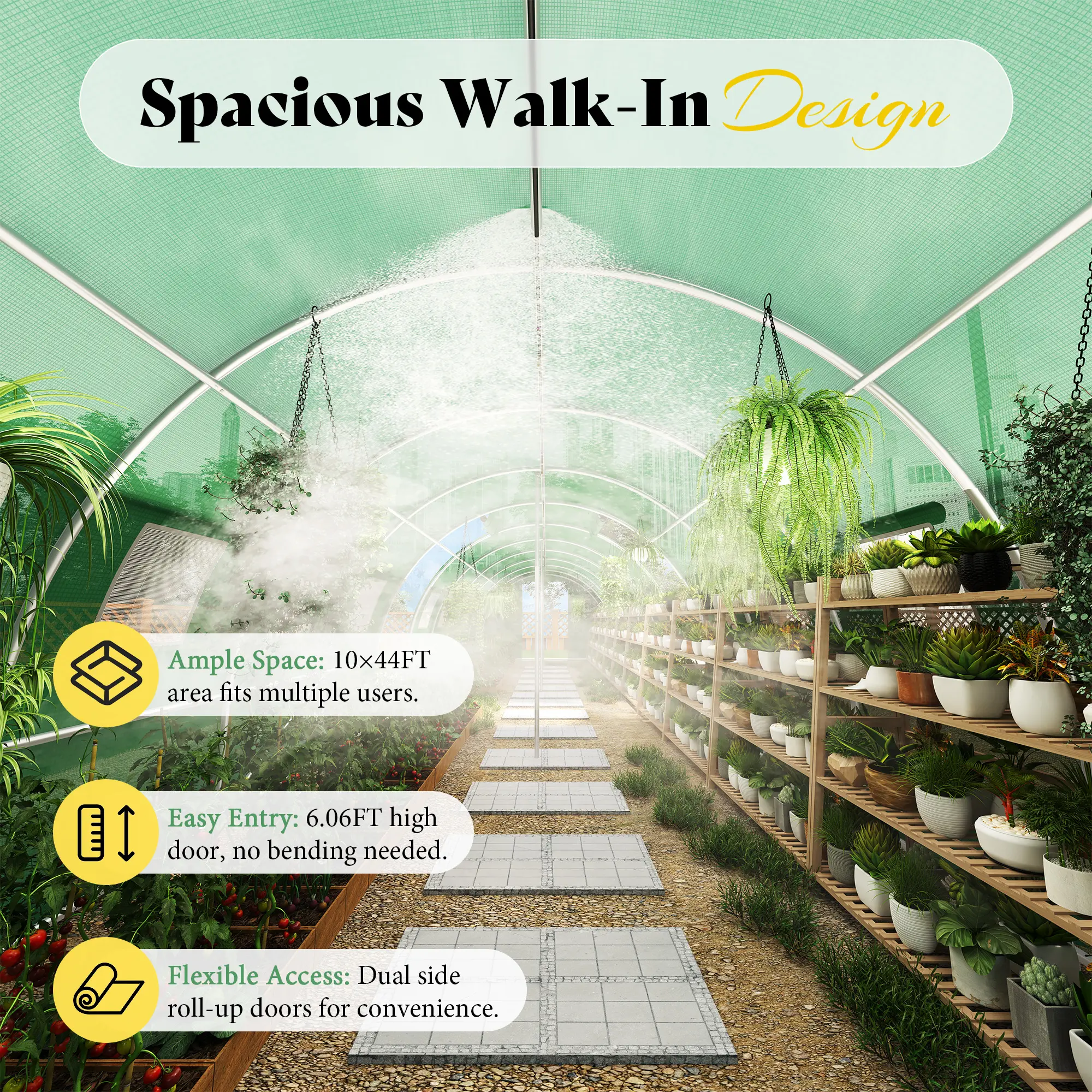 ·Spacious Walk-In Design: The 10×44FT space with a 6.1FT entry height provides roomy interior for family gardening, school use, or small farms. This large greenhouse lets several people work easily without crowding