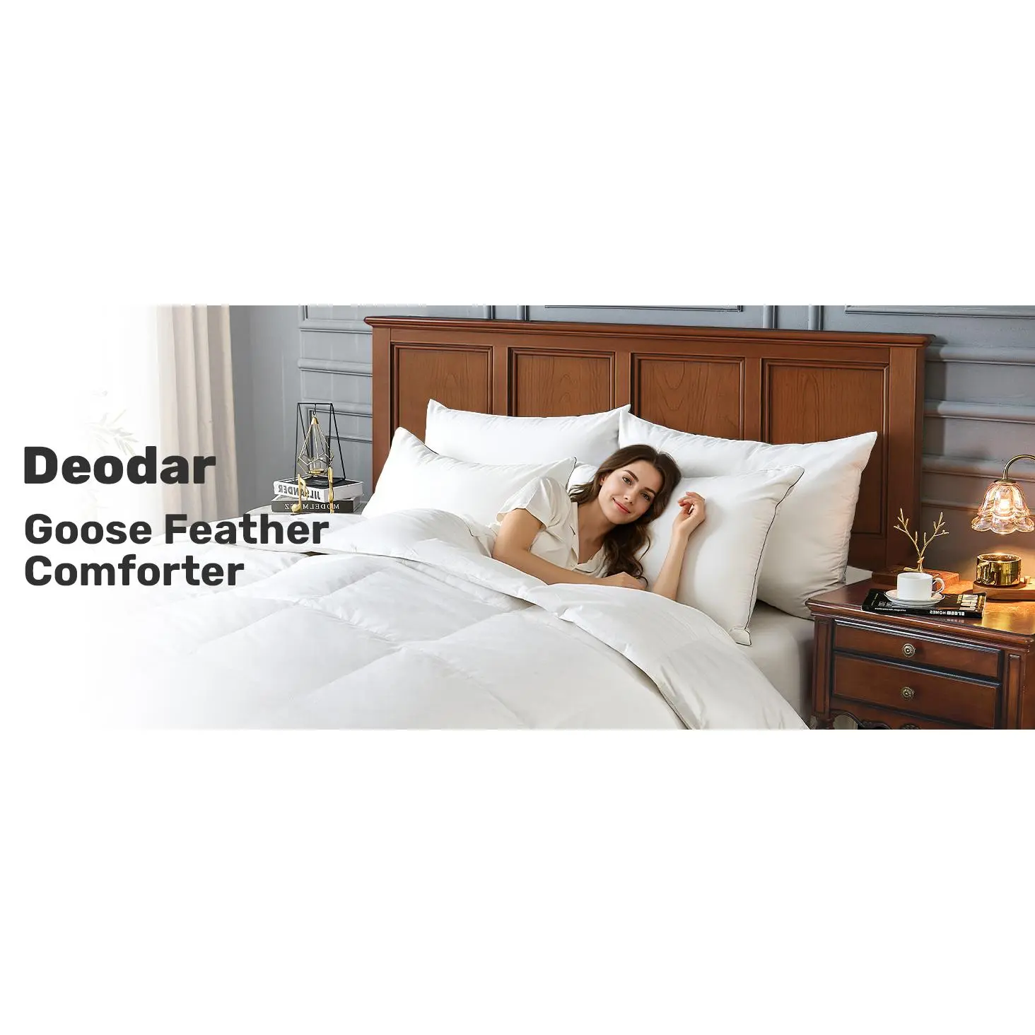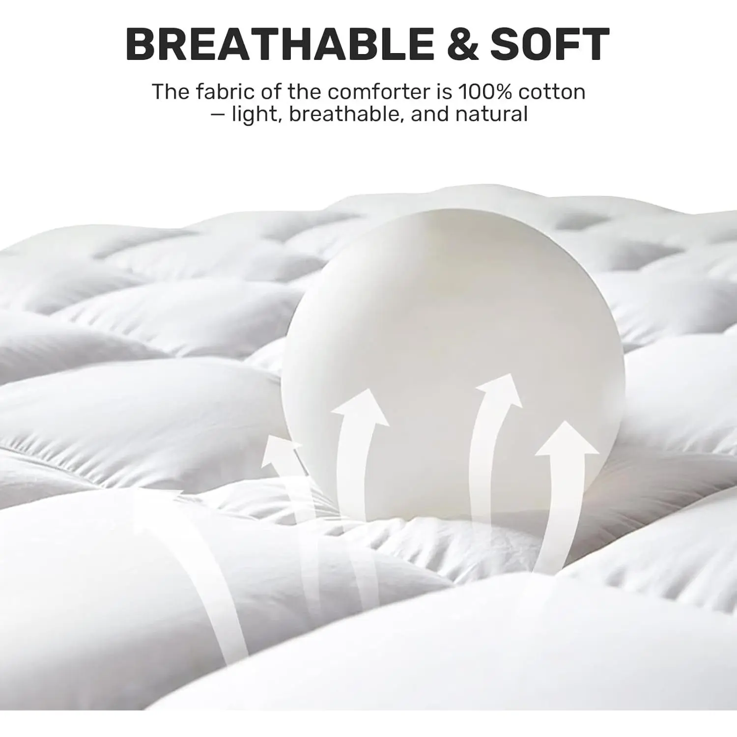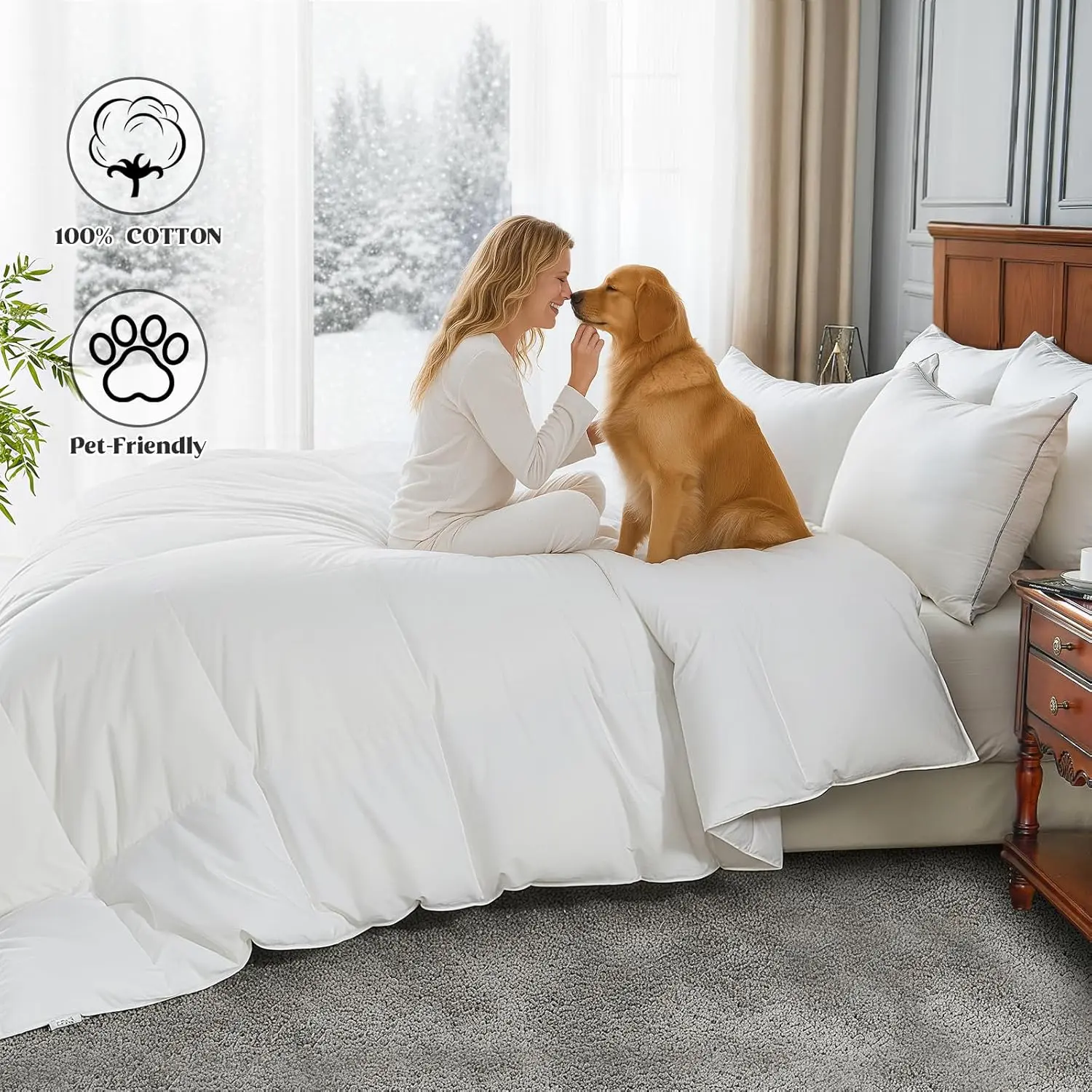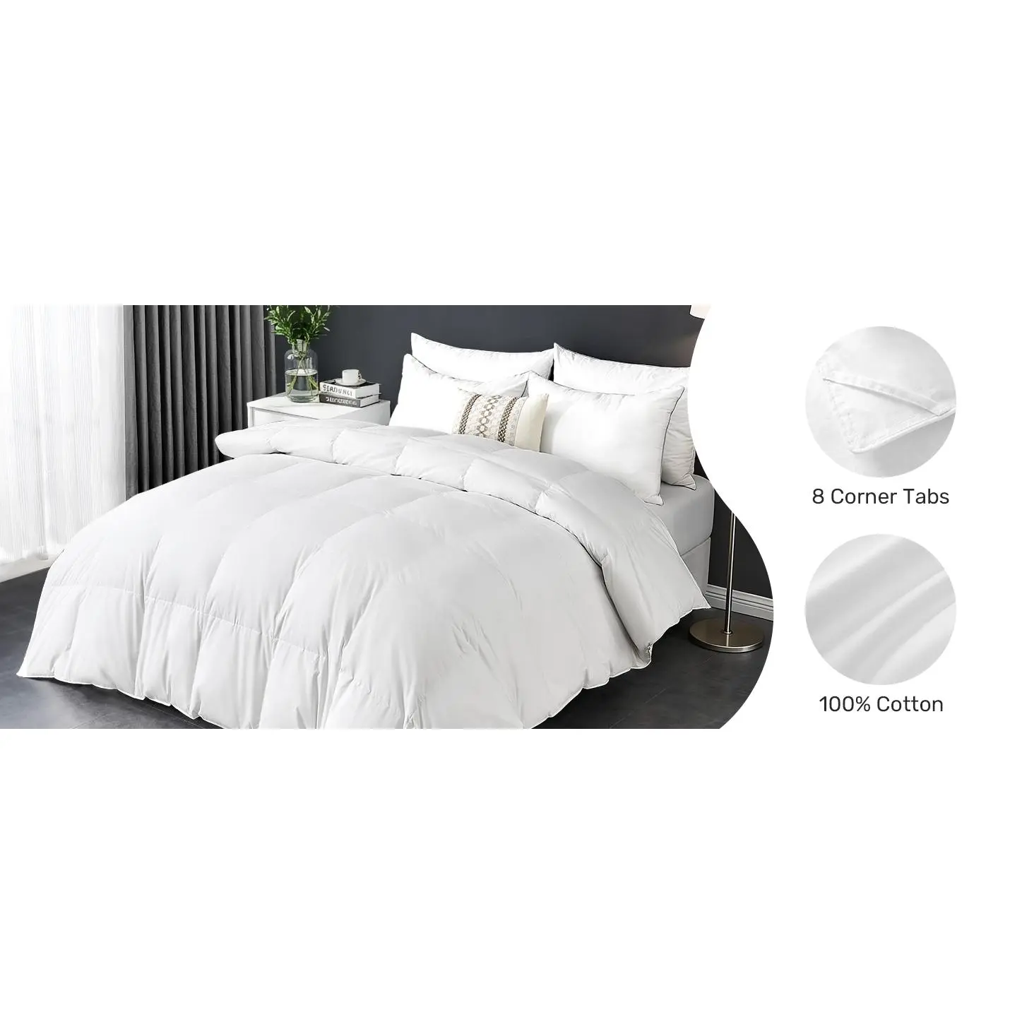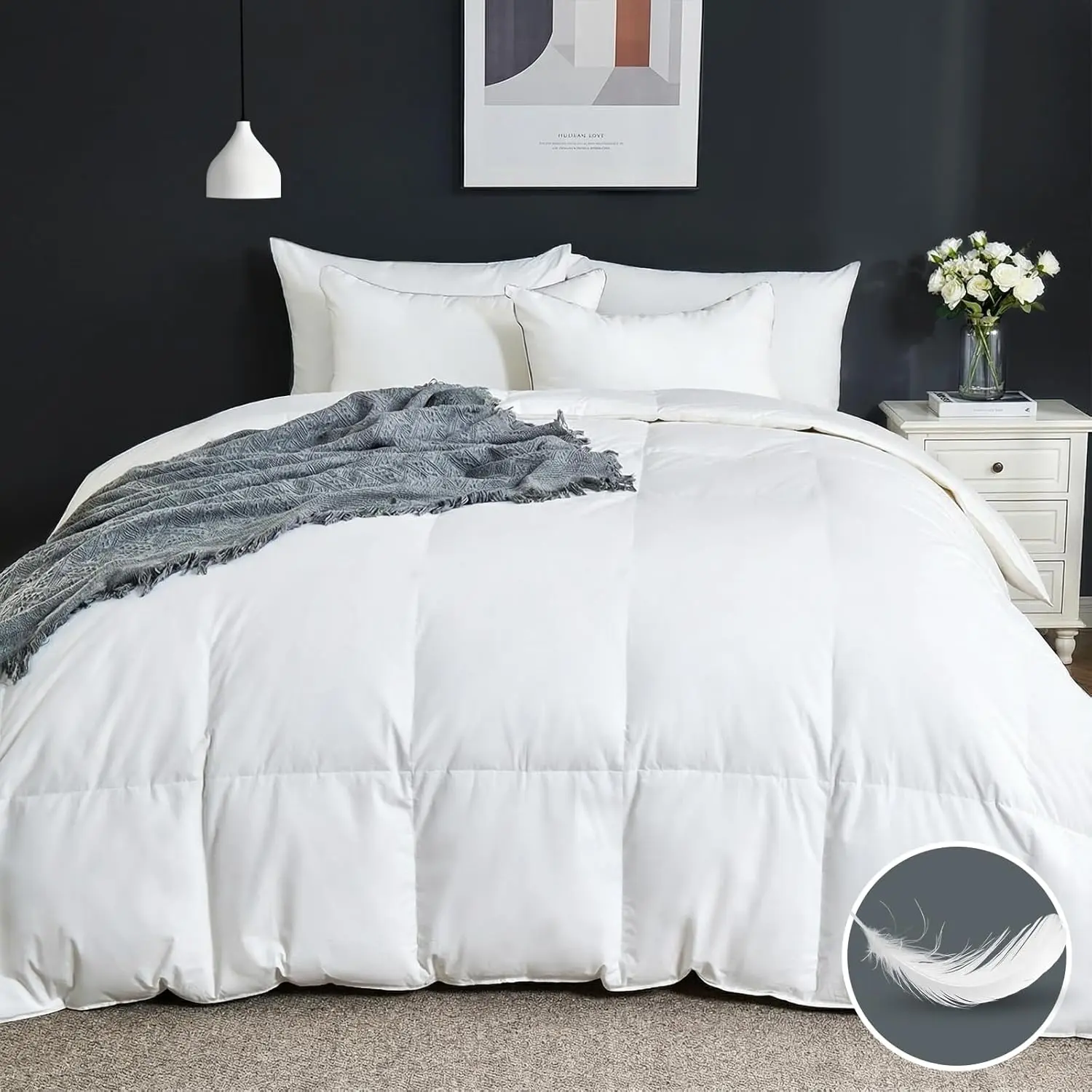 [ClimateComfort Cotton]Fluffy comforter has a soft, breathable 100% Cotton cover. The natural cotton cover is supremely soft and breathable. It wicks moisture for a perfectly comfortable, climate-controlled sleep environment.[Smart Design]The baffle-box construction prevents feather from shifting and maximizes loft for consistent warmth.You can use it by itself or easily slip it into your favorite duvet cover-8 loops keep it securely in place.[All-Season]The Bed comforter uses just the right amount of premium filling to keep you comfortable all year.It's designed to provide cozy warmth when it's cold, yet stays light and breathable for warmer nights-all without feeling heavy.[Fluff-Friendly Care]Machine wash cold separately gente cycle.Tumble dry low until thoroughly dry.it fluffed up more after dried it.[Perfect Fit For All]We offer a full range of sizes to perfectly fit your bed: Twin (68"x90"), Queen (90"x90"), King (106"x90"), California King (104"x96"), and Oversized King (116"x98"). If there is any problem, please feel free to contact us