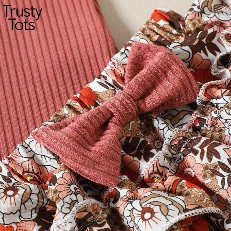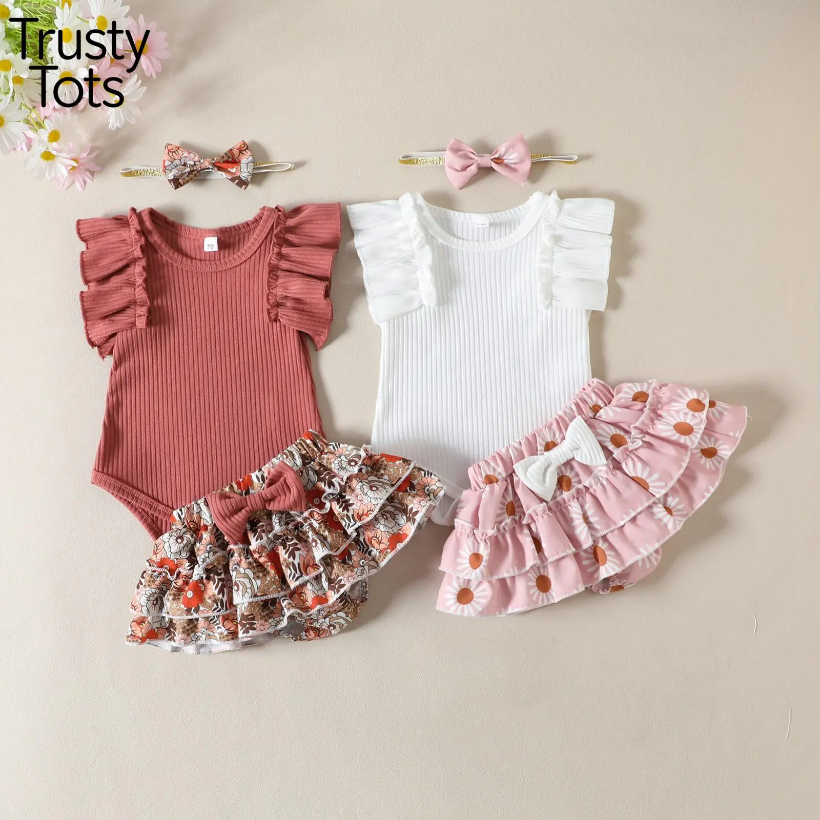 Baby Girls Summer Outfit Sets Ruffle Sleeve Ribbed Romper + Floral Culottes + Headband