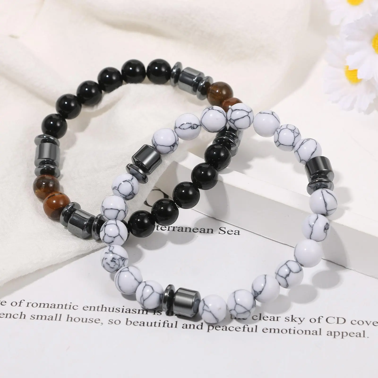 ·Natural Materials: This set includes tiger eye, black glass, white turquoise, and lava stone beads, each 0.34" (8 mm) in diameter. The inner circumference is 6.30" (16 cm), with an elastic adjustable fit. Weighing only 3.39 oz (95 g), it's lightweight for all-day wear.