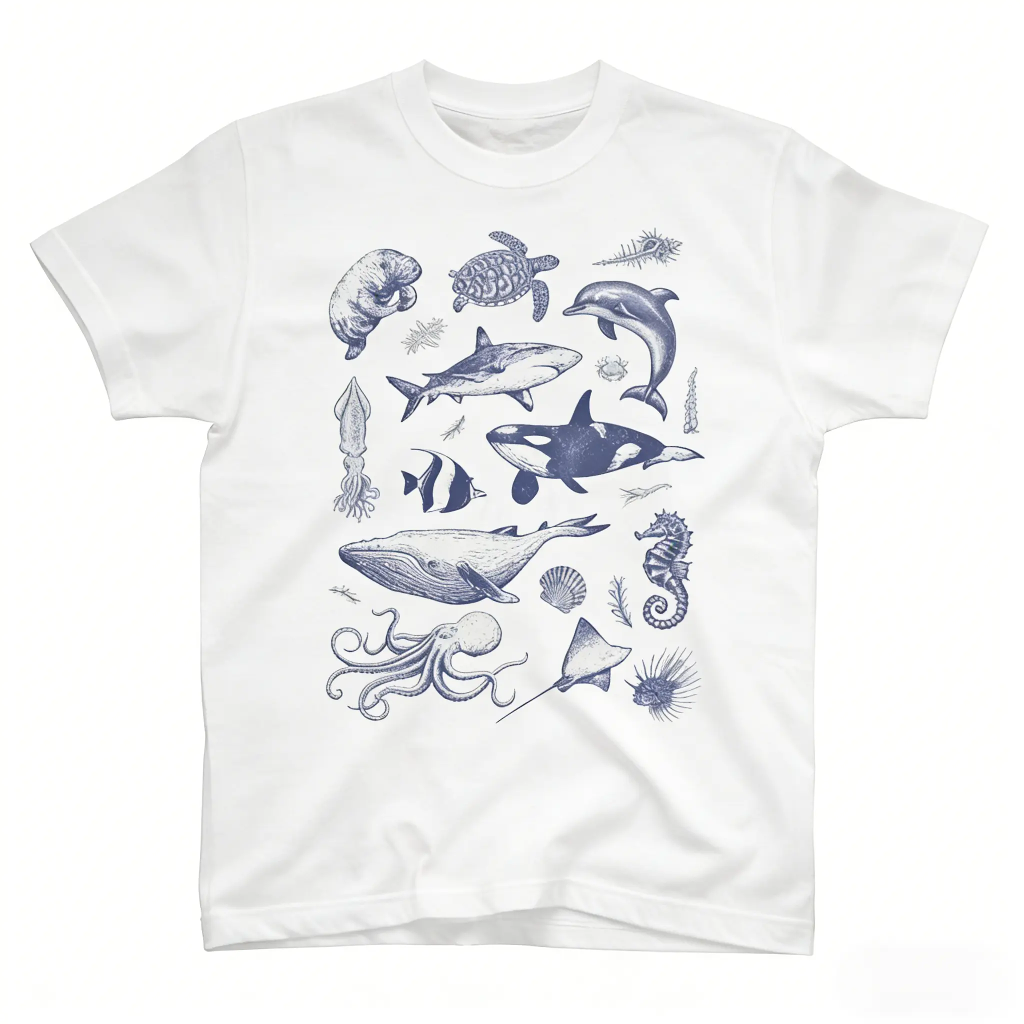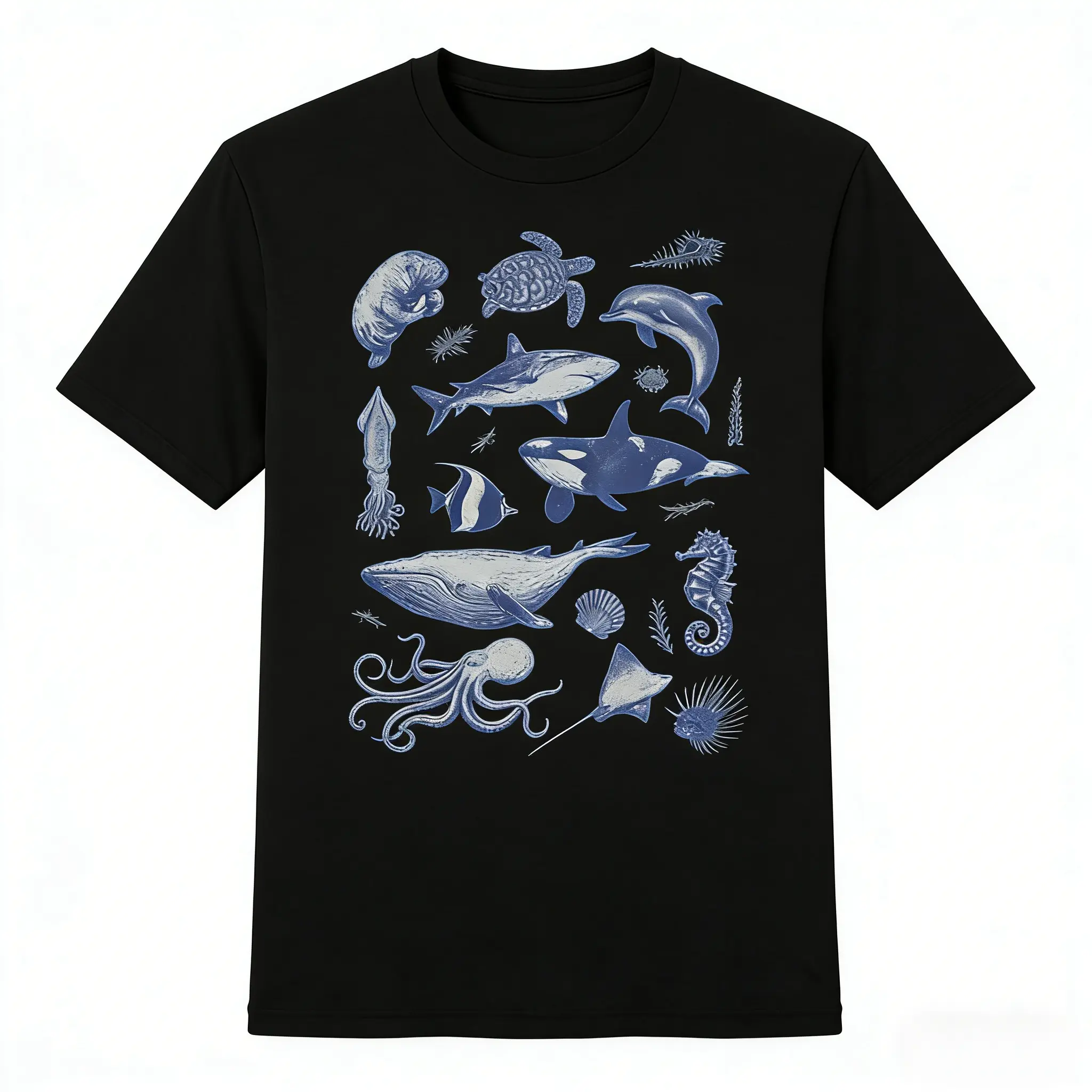 Elevate your beachwear style with this stunning pieceVintage Marine Life Pattern T-ShirtFeaturing hand-drawn retro-style iconic marine creature collages-including sharks, dolphins, whales, octopuses, turtles, and more-this T-shirt is a dream come true for ocean enthusiasts, marine biologists, and anyone who loves vintage nautical art. The soft cream-colored (or black/white) background paired with classic blue line art creates a timeless aesthetic look. It's perfect for beach vacations, aquarium visits, casual outings, or everyday wear. Ultra-soft, breathable, and extremely stylish, it's the ultimate accessory for anyone who loves the ocean