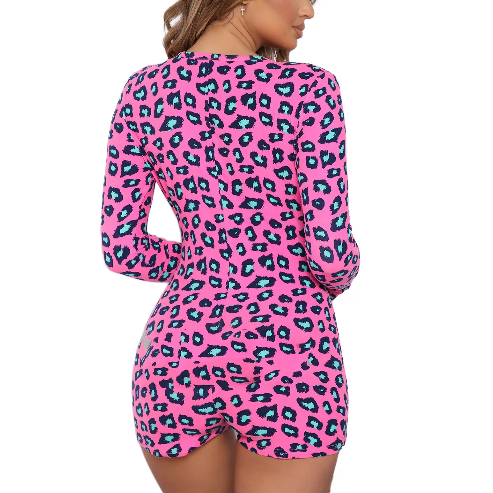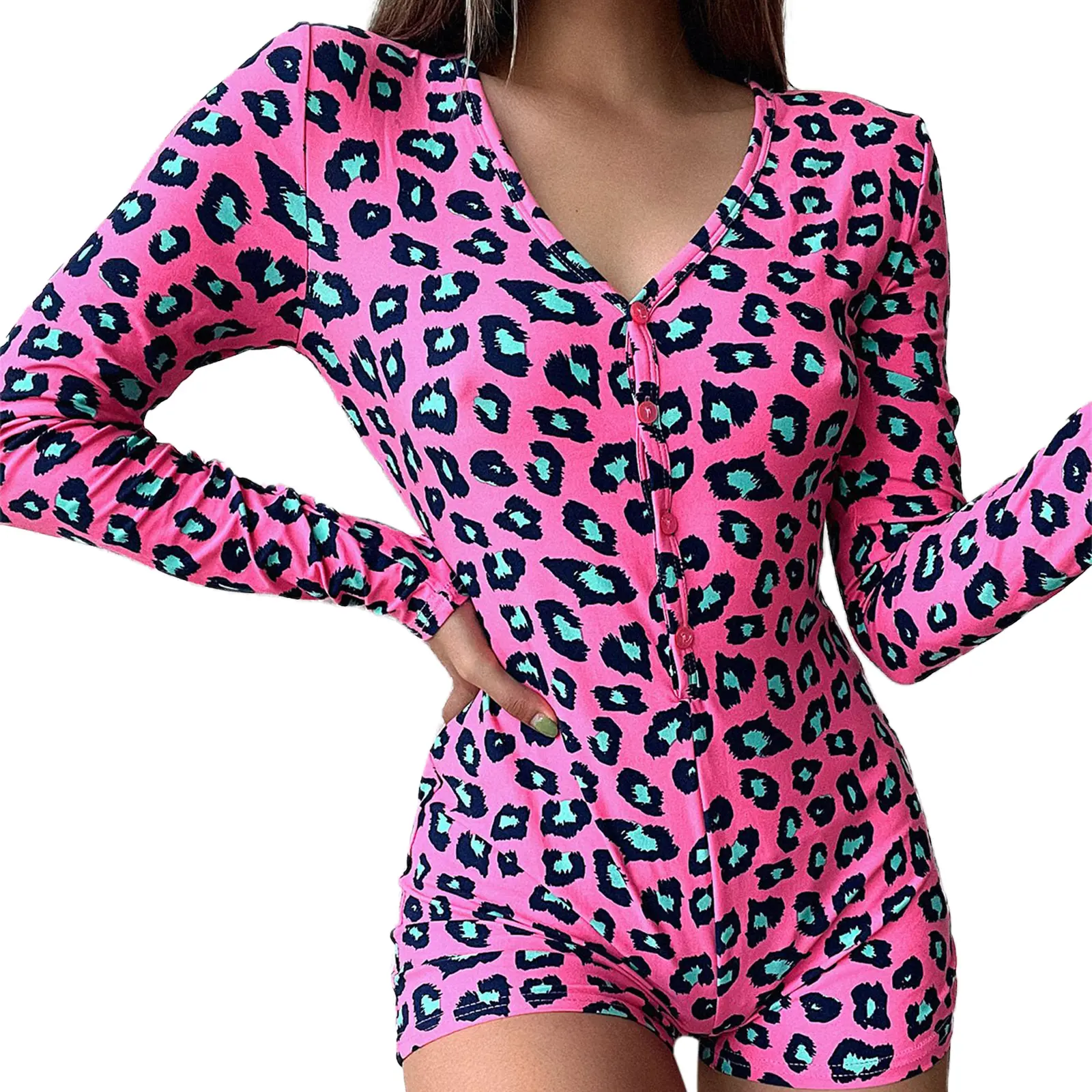 Women's Sexy Romper Shorts, Funny Print Long Sleeve Button Down Deep V Neck Bodysuit