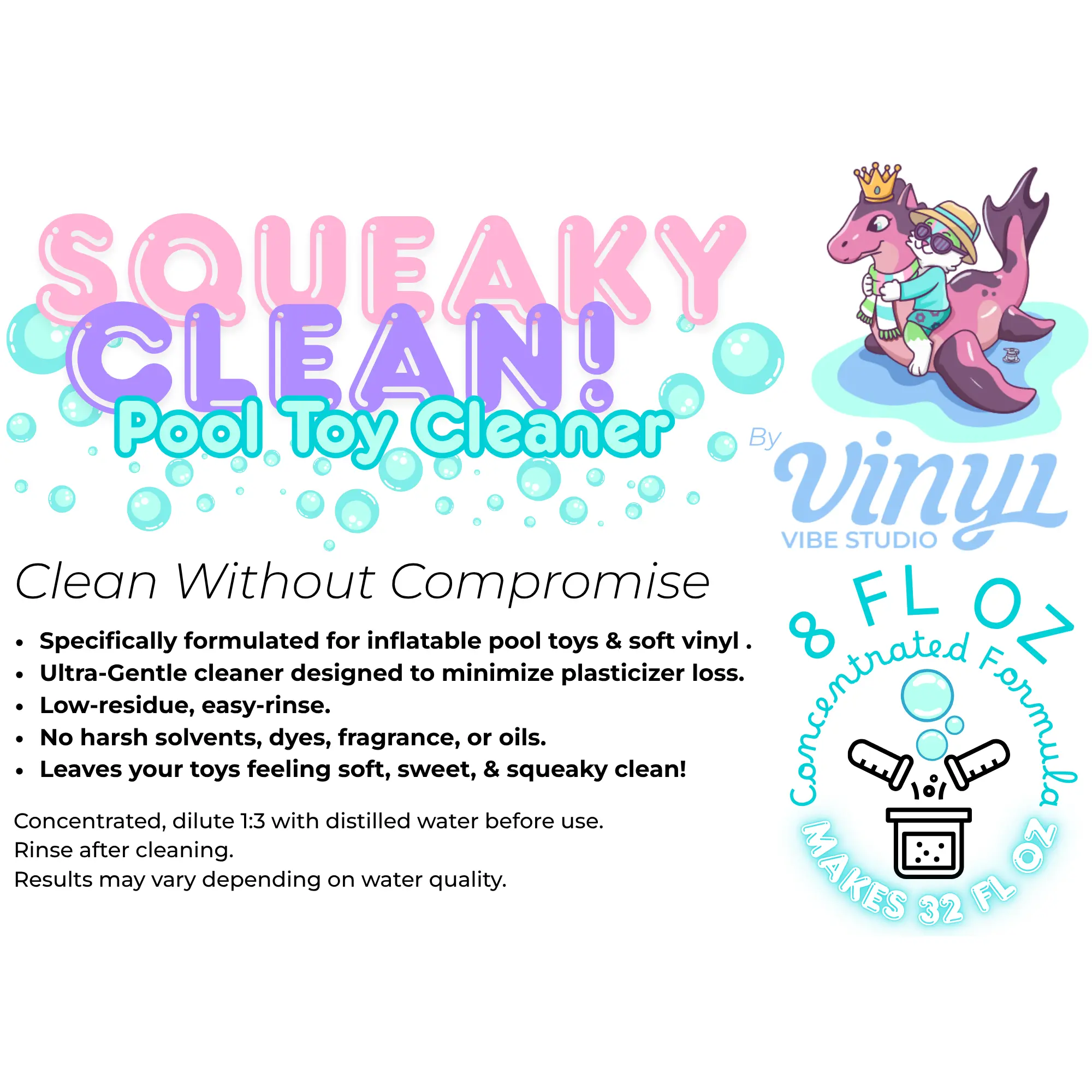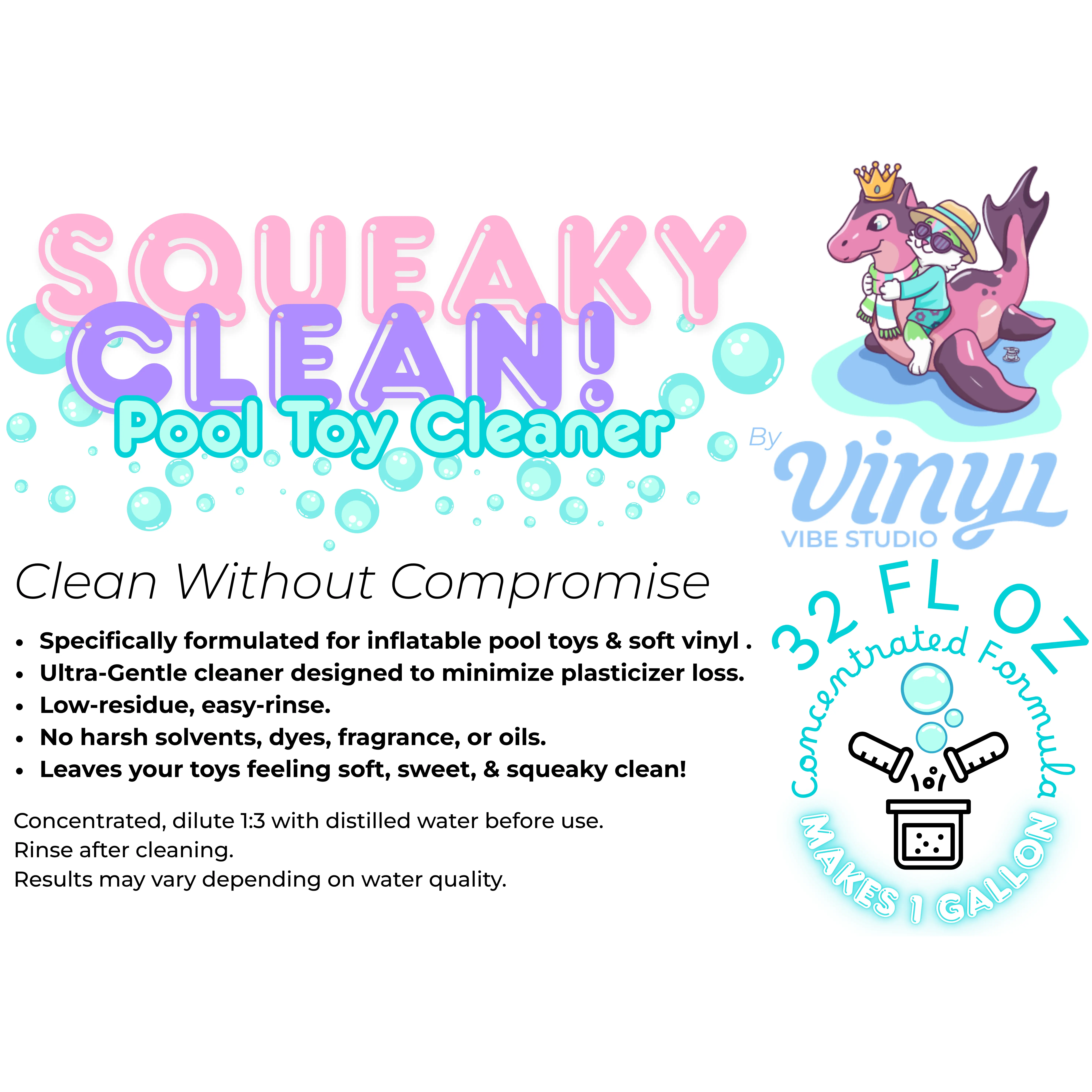 Squeaky Clean is formulated to minimize plasticizer extraction, help maintain long-term vinyl integrity, and offer a safer option for vinyl than many of the cleaners commonly used by pool toy enthusiasts, such as Dawn dish soap, Fairy, and similar products.