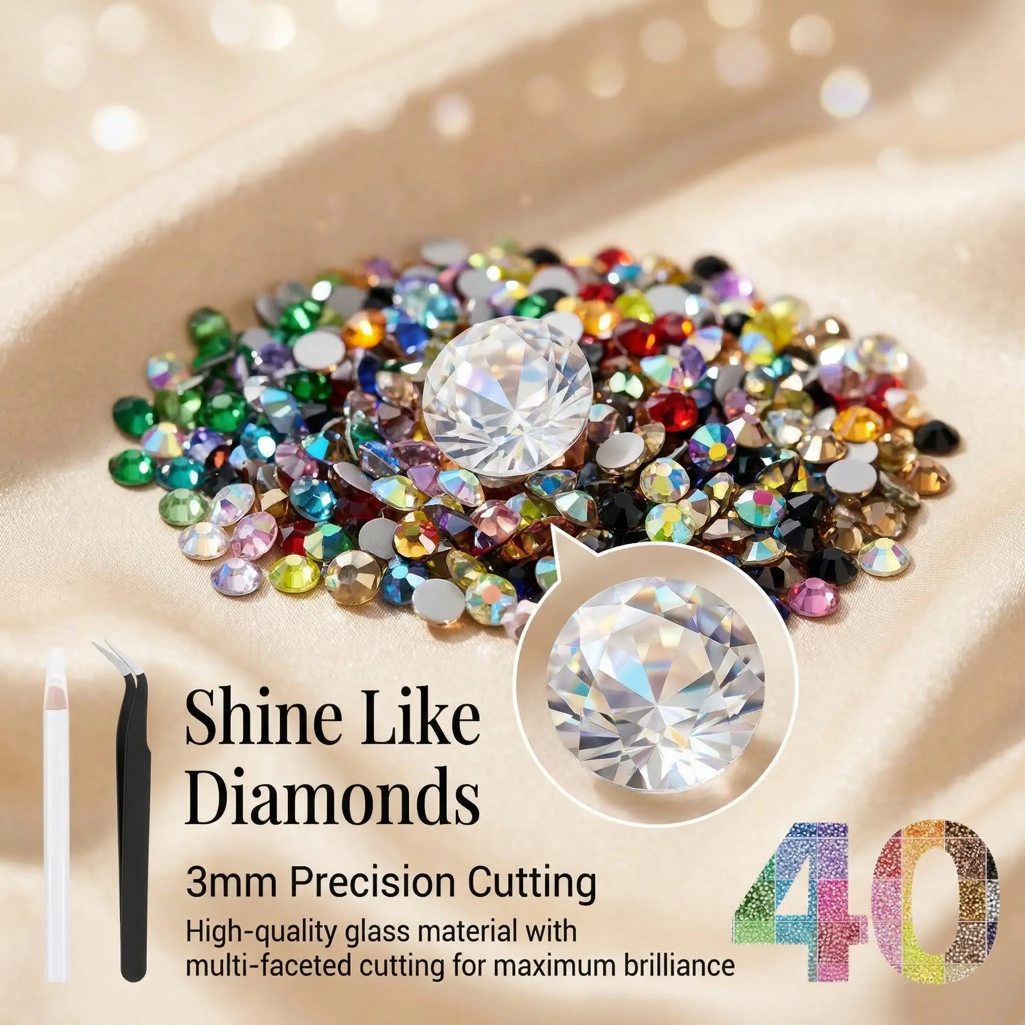 40 GRIDS VIBRANT GEMS ResinRhinestones,Flatback Beads with Tweezers for Crafting Mixed-Color 3mm Bedazzling Crystal with Gifted ToolsJewelry for DIY Crafts Clothing Tumblers Shoes Fabric Nail Art ,for Bedazzling Kit Flatback diamond painting art tool