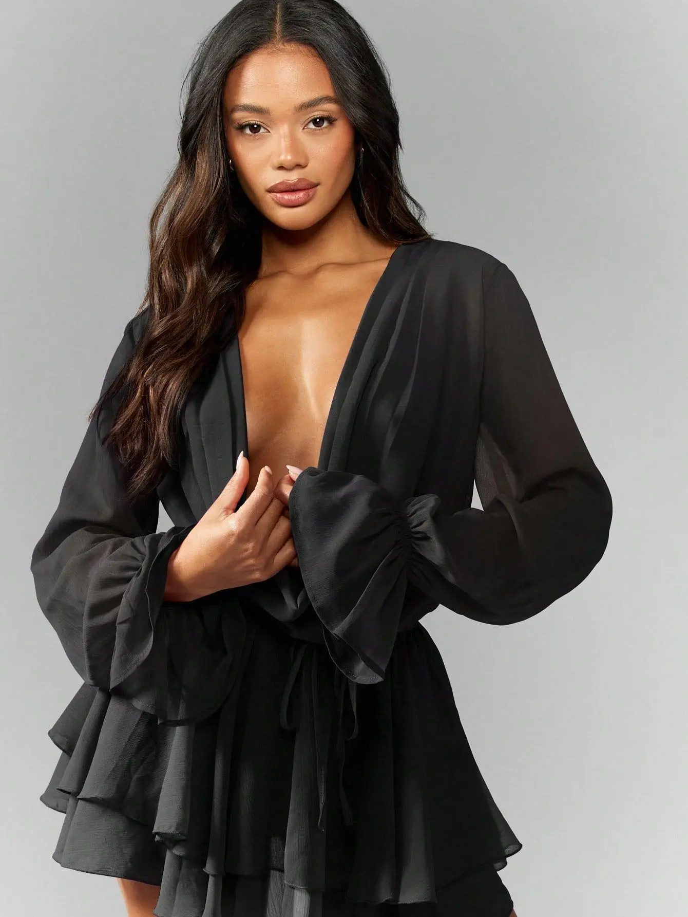 MISSGUIDED Chiffon Balloon Sleeve Cowl Neck Open Back Ruffled Tiered Skirt Mini Dress