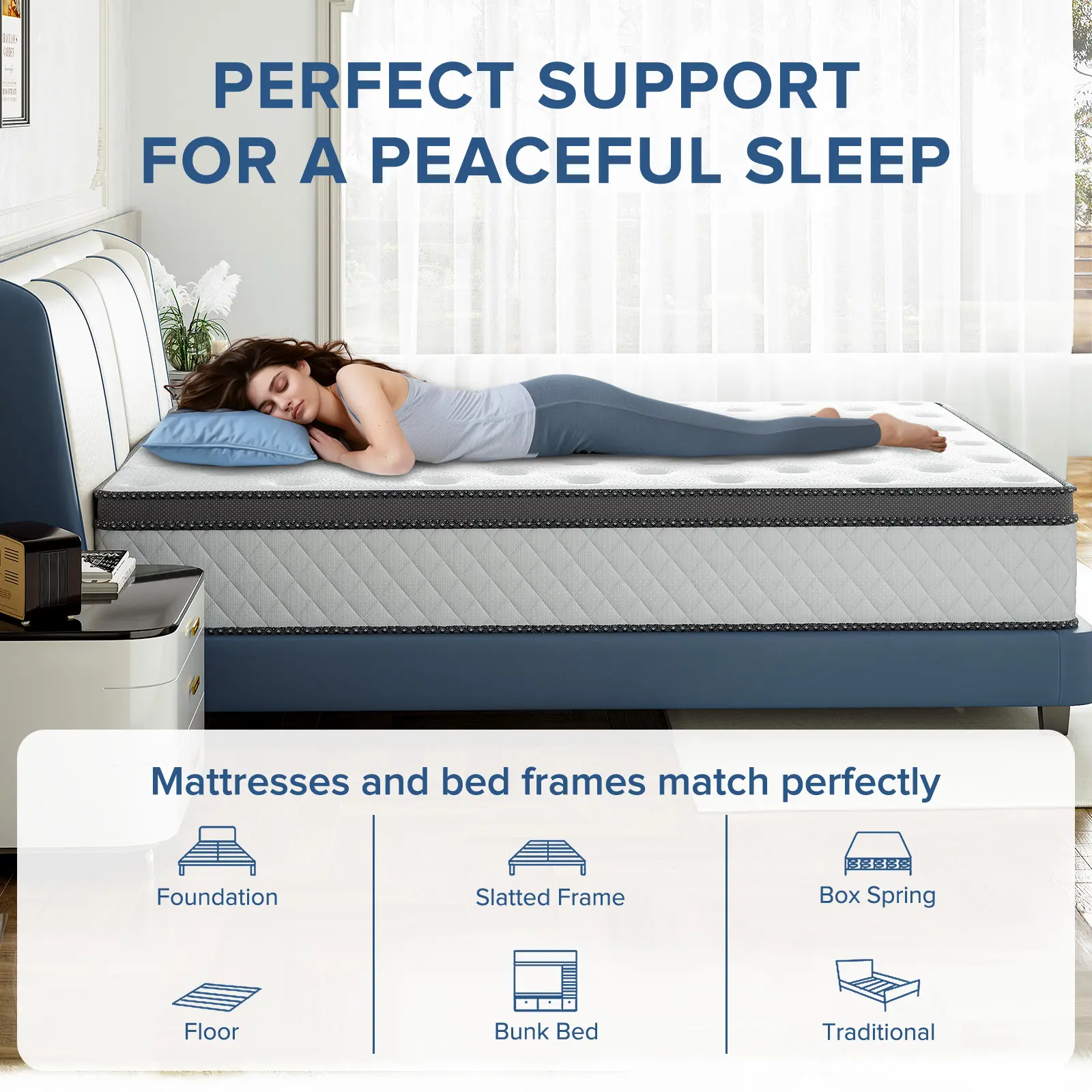 Transform your nights with our mattress. It features thicker coil springs for superior support and provides ergonomic pressure relief. Enjoy undisturbed rest with motion isolation and a luxurious combination of anti-static fabric and moisture-wicking cotton. Easy to install and stylishly designed, it's the perfect addition to any bedroom. Plus, sleep worry-free with our safety certifications and a 10-year warranty. Upgrade your sleep today!