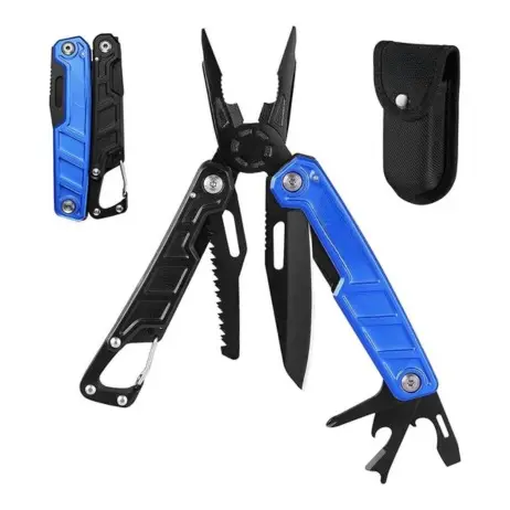 ·Includes long and regular pliers, wire cutter, saw, knife, Phillips and slotted screwdrivers, wire stripper, bottle opener, can opener, and a carabiner (not for climbing).