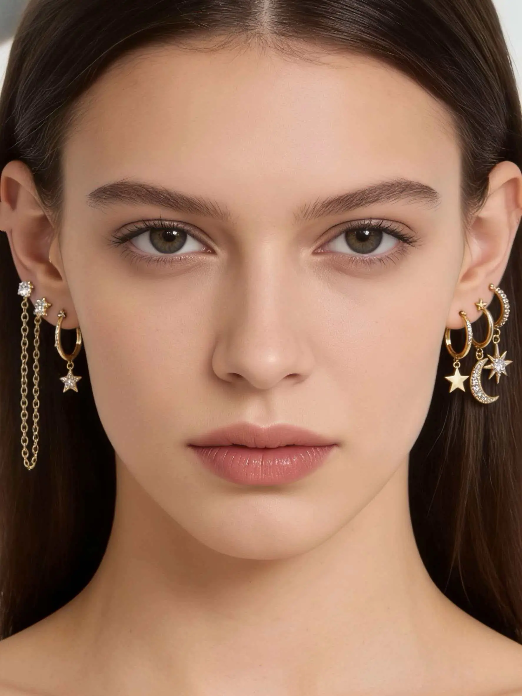 Mix, match, and layer to create your signature look: wear the dainty chain-link star studs for a subtle everyday glow, stack the hoops for an edgy curated ear aesthetic, or pair the crescent moon and starburst charms for a dreamy, celestial-inspired vibe. Perfect for multiple piercings, this set lets you express your unique style, no matter the occasion.