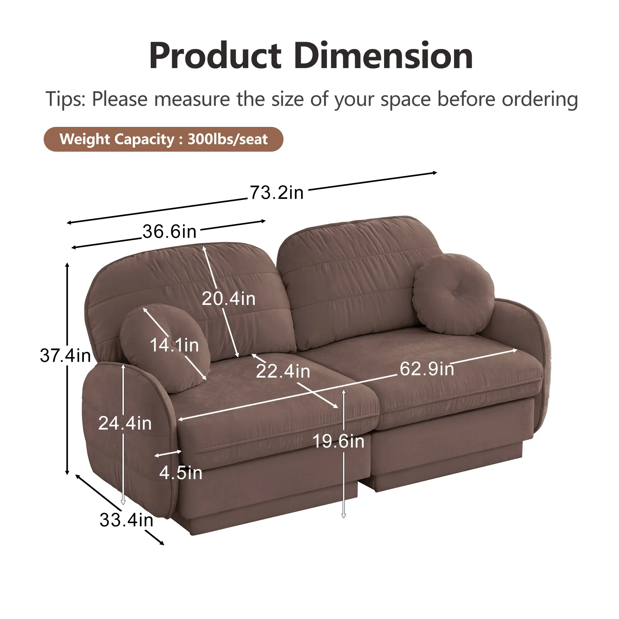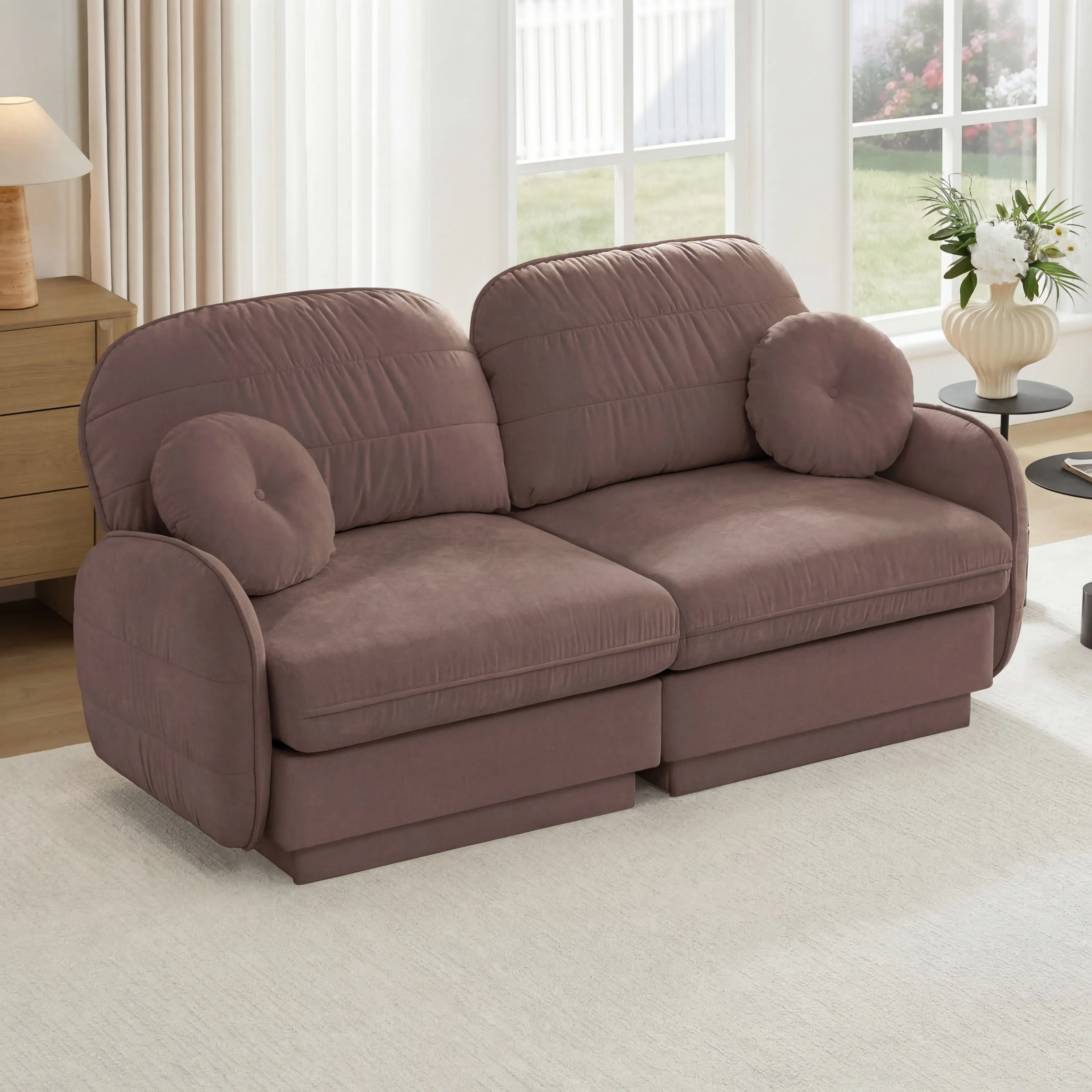 The deep ergonomic seat and round throw pillows enhance your lounging experience to the fullest.
