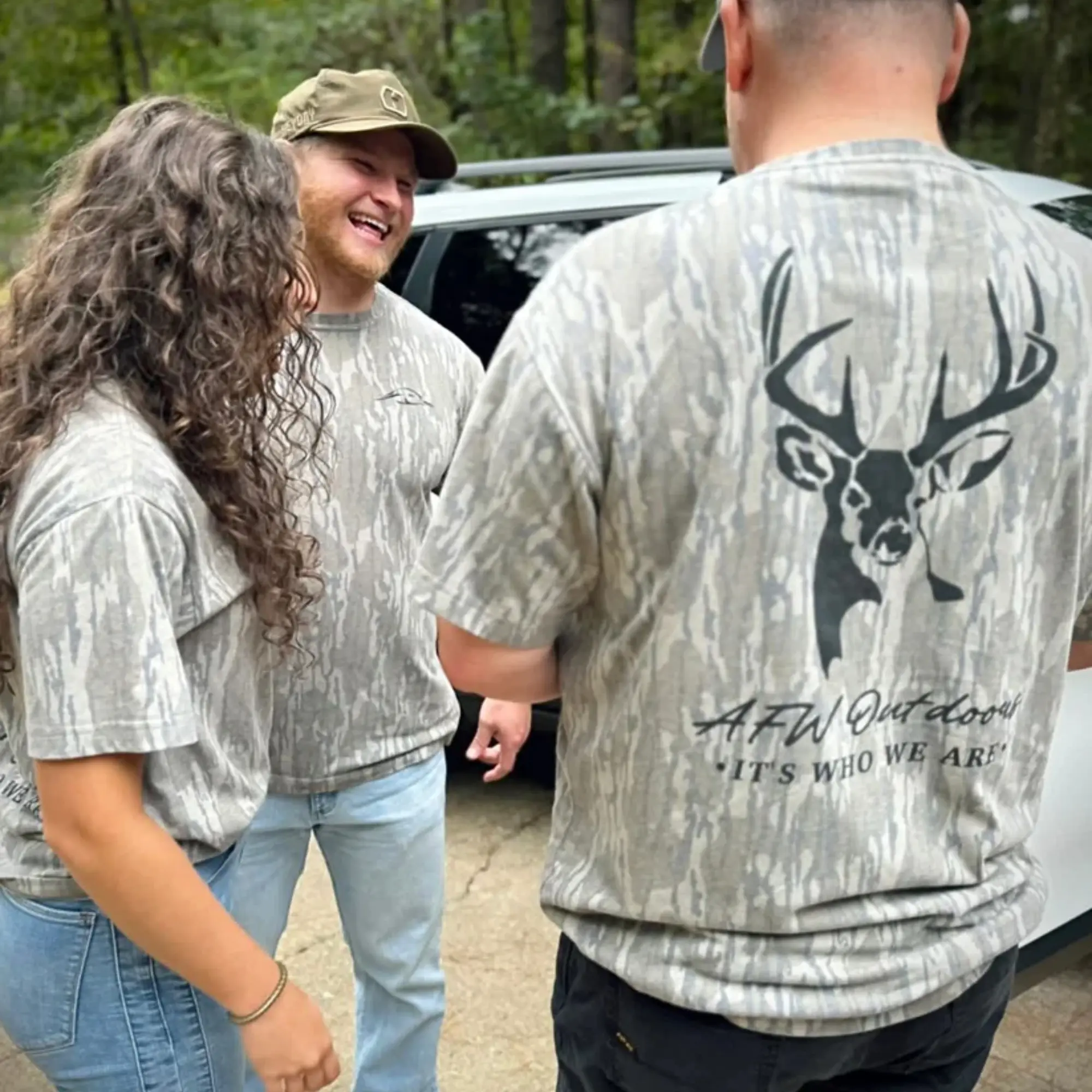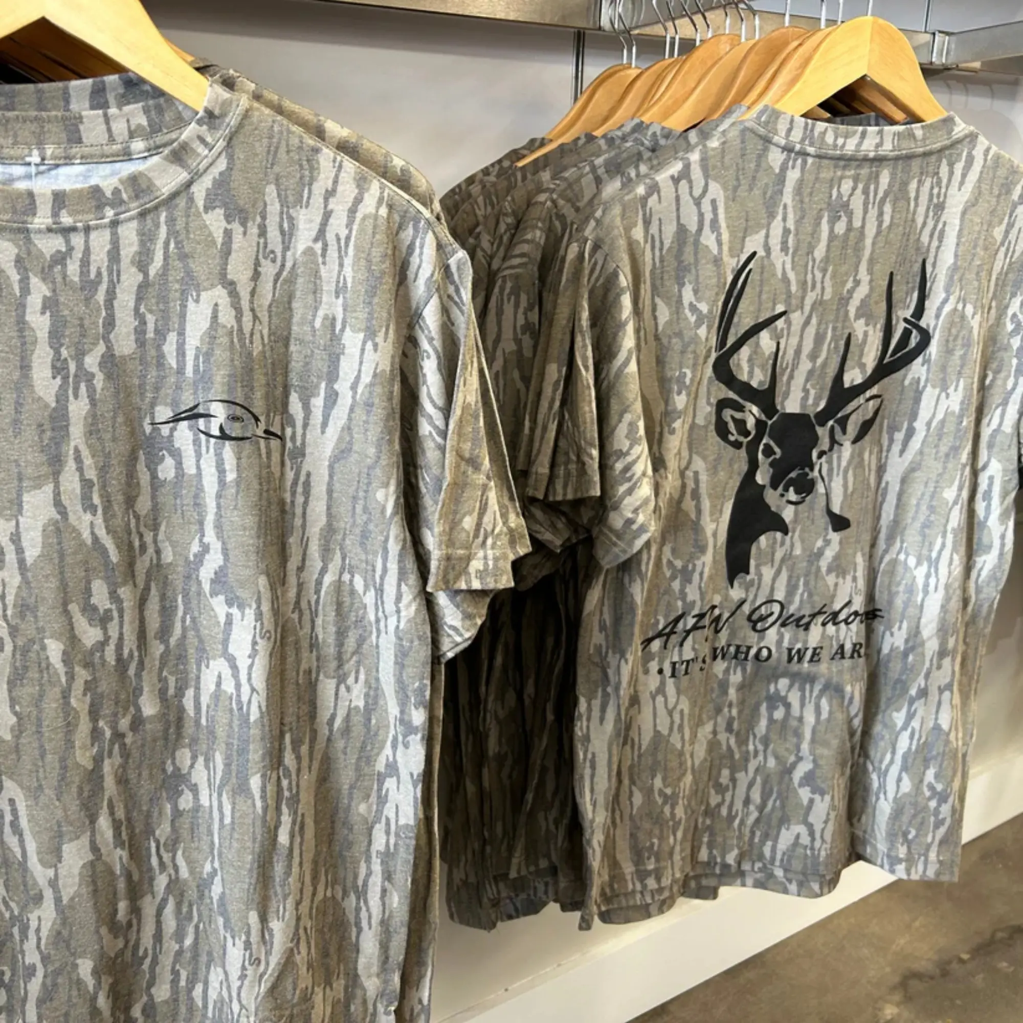 American Flyway Waterfowl Outdoors Buck Mossy Oak Tee, It's Who We Are Original Bottomland T-shirt For Men And Women, Camo Pattern Crewneck, Hunting Deer Camo Tee
