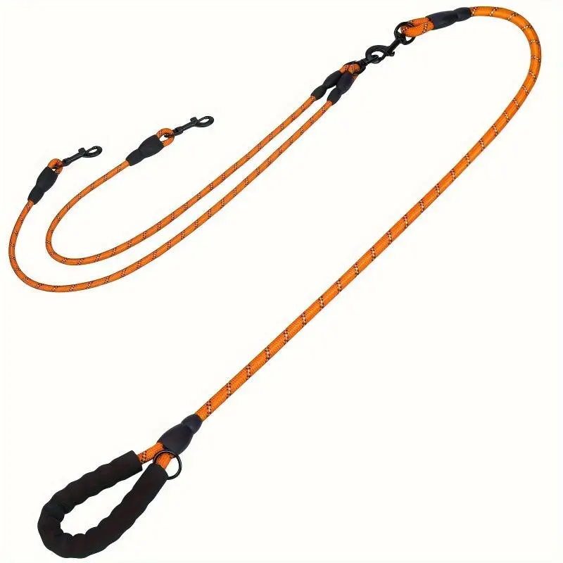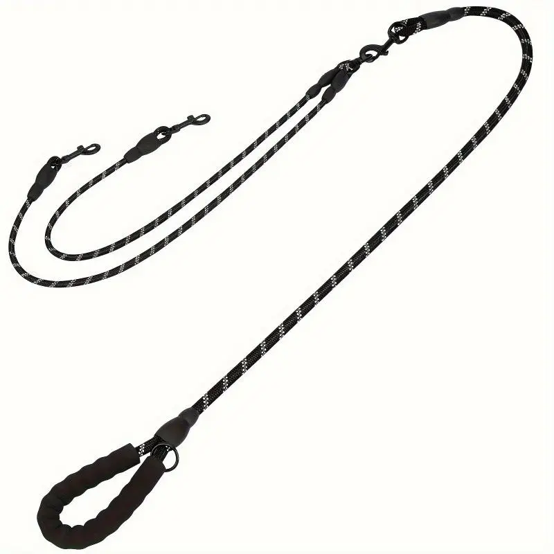 A 4-foot long leash and a 30-inch durable leash connector made of 1/3-inch thick reflective nylon rope, designed specifically for puppies and small dogs. It prevents the 360° rotation of the connector from tangling, making it ideal for daily walks. Use this dual dog leash to easily walk two dogs at the same time.