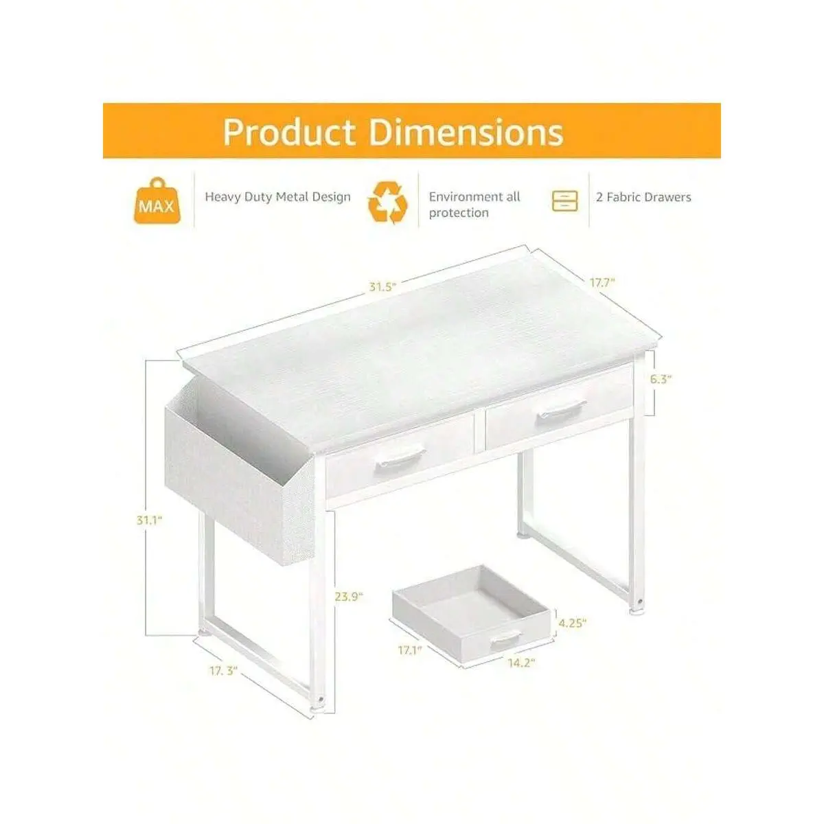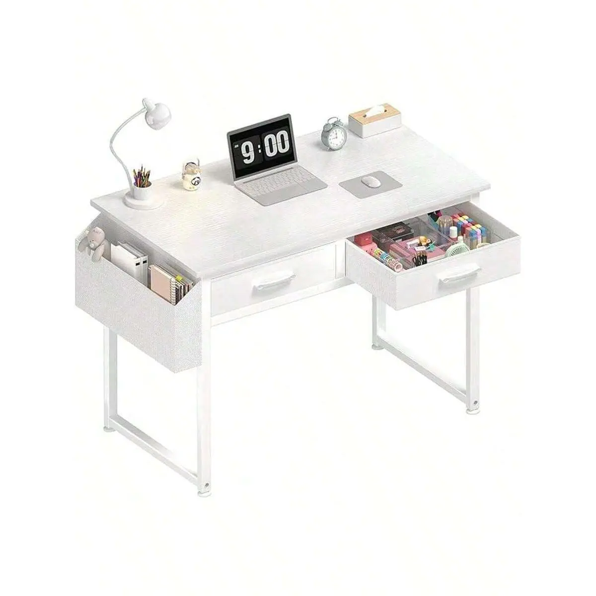 [Modern Simple Design with Ample Storage]Featuring a modern simple style, this desk comes with 2-tier open fabric drawers, providing plenty of under-desk storage space to organize stationery, makeup essentials, books, and other small items.Crafted from thick P2 particle wood (MDF) with a scratch-resistant, anti-collision, and waterproof powder-coated finish, it effectively protects the desktop from daily wear and tear, ensuring long-term use.