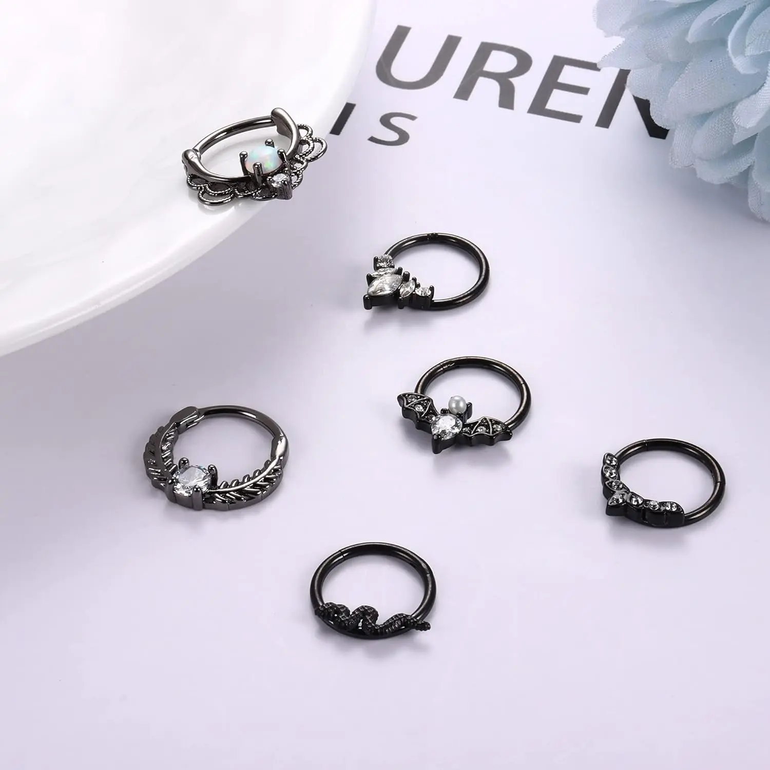Looking for the perfect mix of edgy and dainty? This 6-piece septum ring set is a whole vibe. From mystical bats to elegant opals, we’ve got your daily piercing rotation covered.