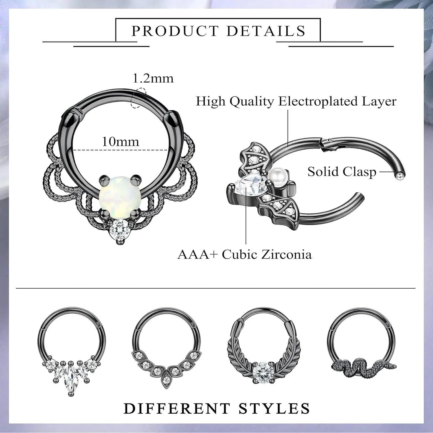 ·Variety Pack: 6 unique styles in one set—featuring CZ gems, iridescent opals, and our fan-favorite Gothic Bat & Nature Leaf designs.