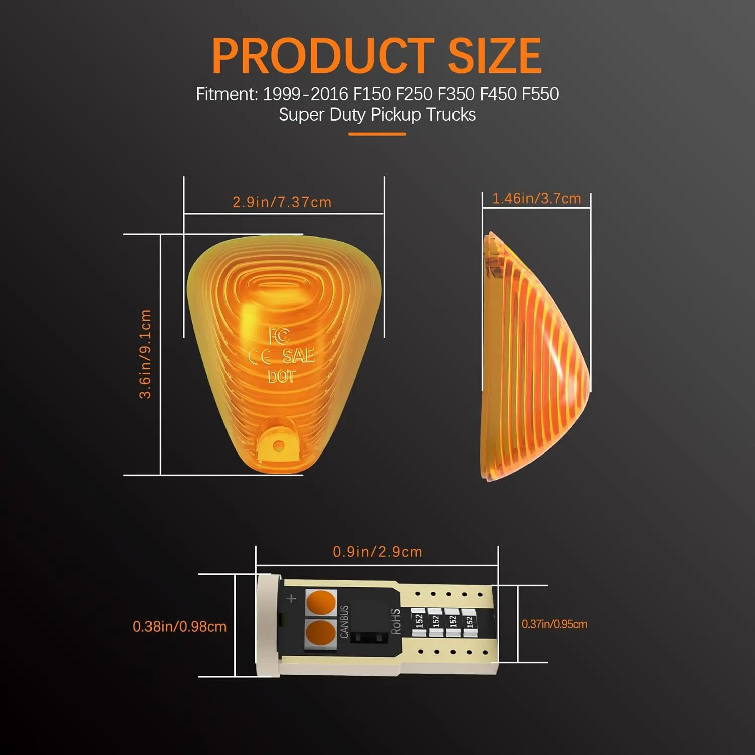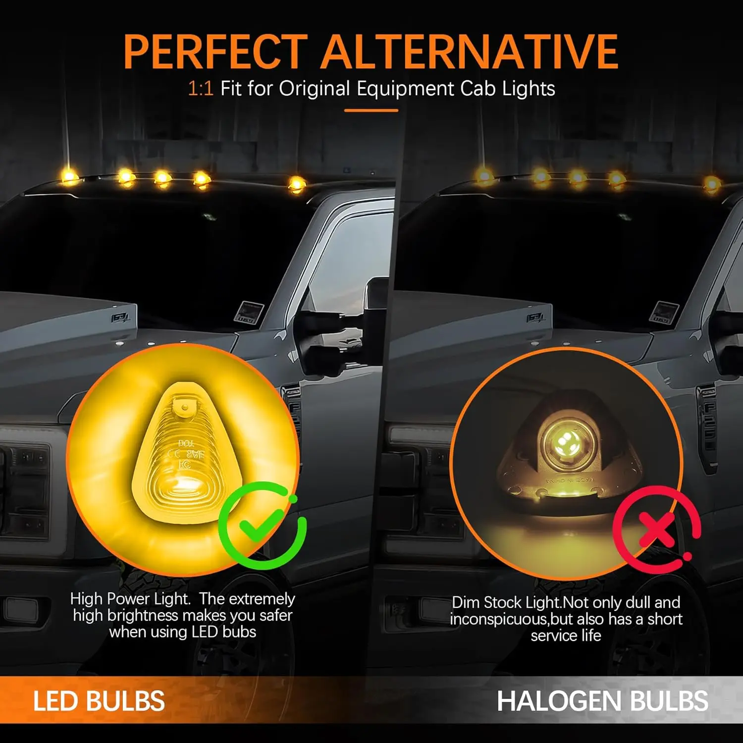 ·Package Includes: 5 pieces amber LED bulbs for cab marker lights+ 5 pieces amber roof cab marker light lens.