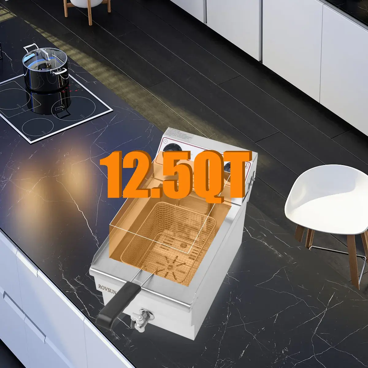 1. 12.5QT CAPACITY: The maximum capacity of the fryer tank is about 12.5QT. Recommended oil capacity up to 7.5QT. What’s more, it comes with a frying basket, which brings more convenience. Basket capacity: 6.55QT. (NOTE: There are white protective tapes on surface. Please peel off them before use.)