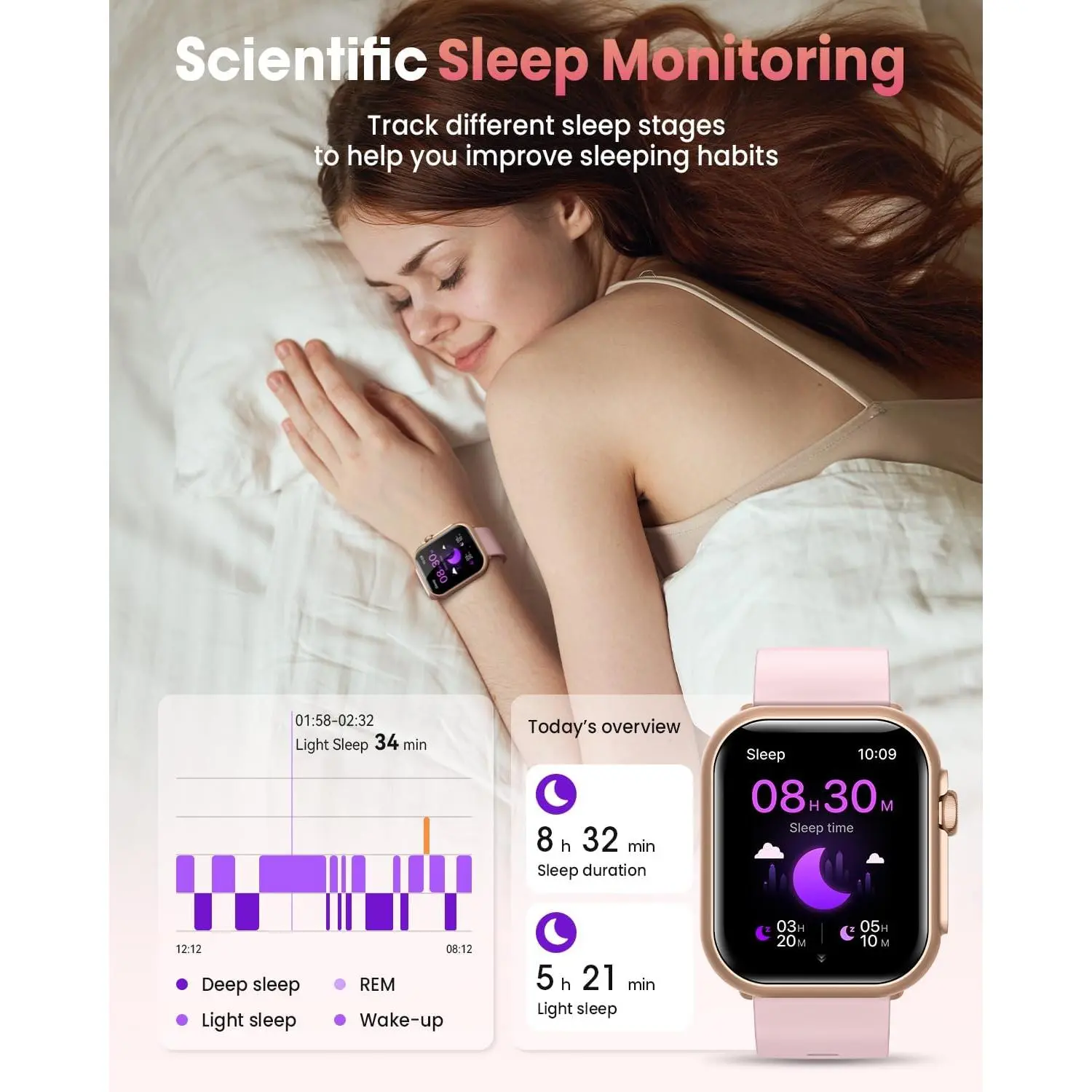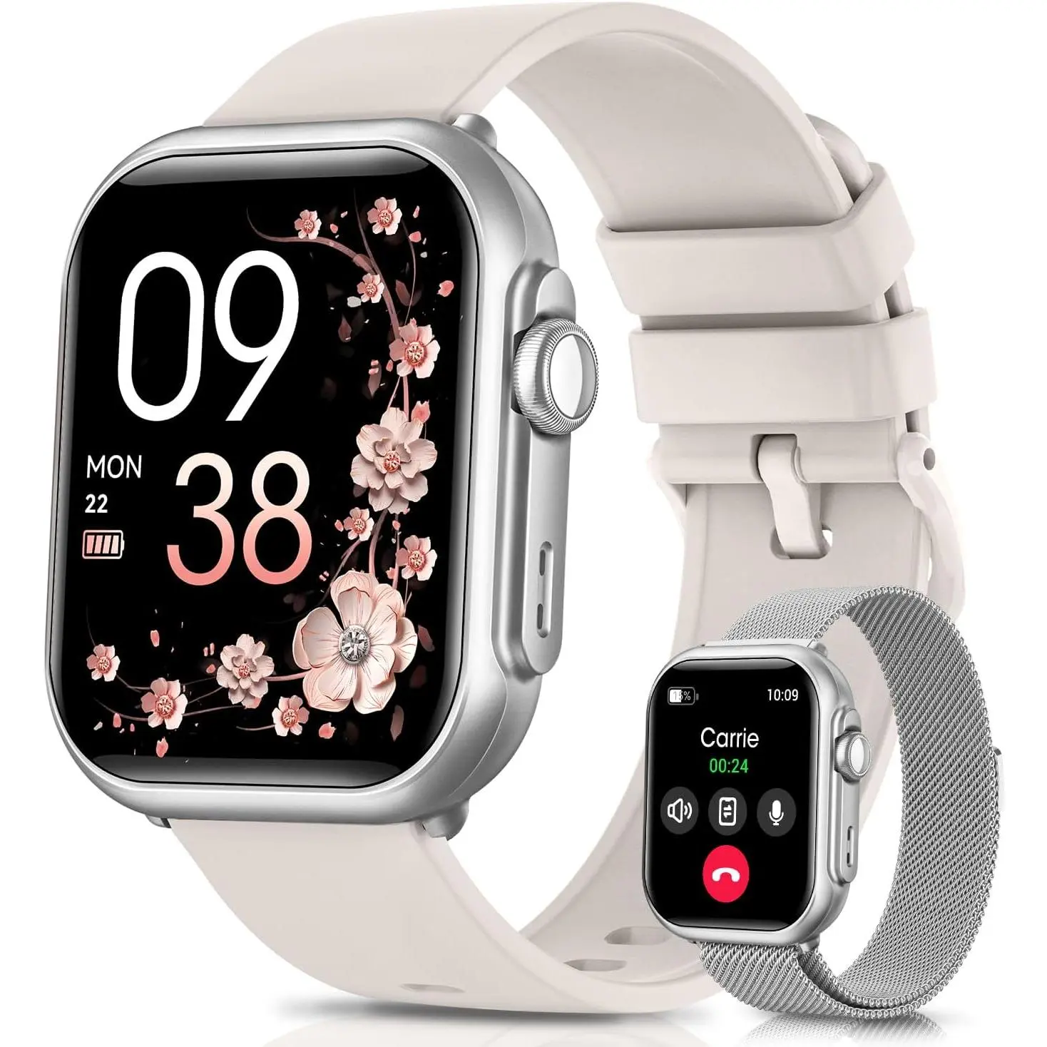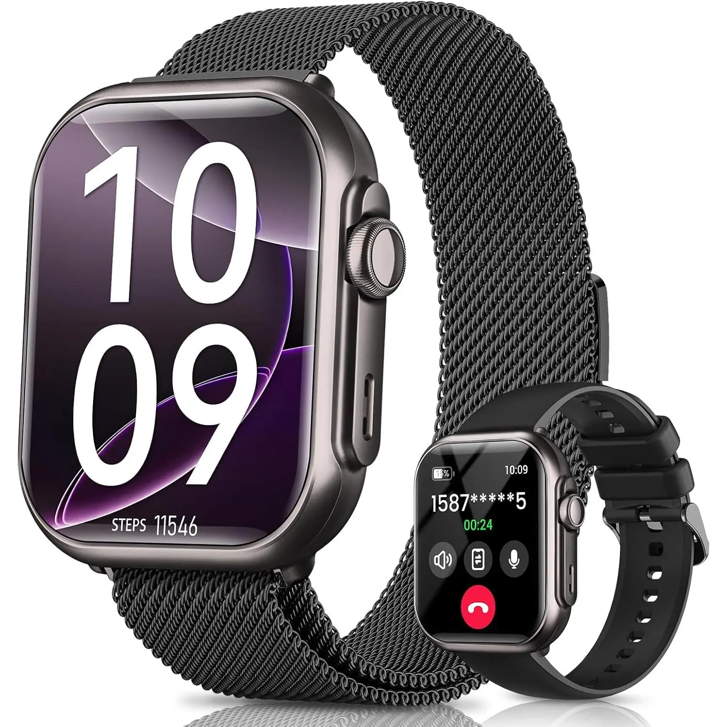 Unisex fitness smartwatch: compatible with iPhone and Android devices, supports Bluetooth calling, features heart rate and blood oxygen monitoring, has an IP68 waterproof rating, offers a battery life of over 30 days, and comes with 2 straps