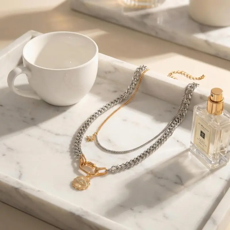Tired of choosing between gold and silver? The rules of fashion have changed. Meet our Mixed Metal Layered Necklace—the accessory that breaks the old rules and brings your jewelry collection together.