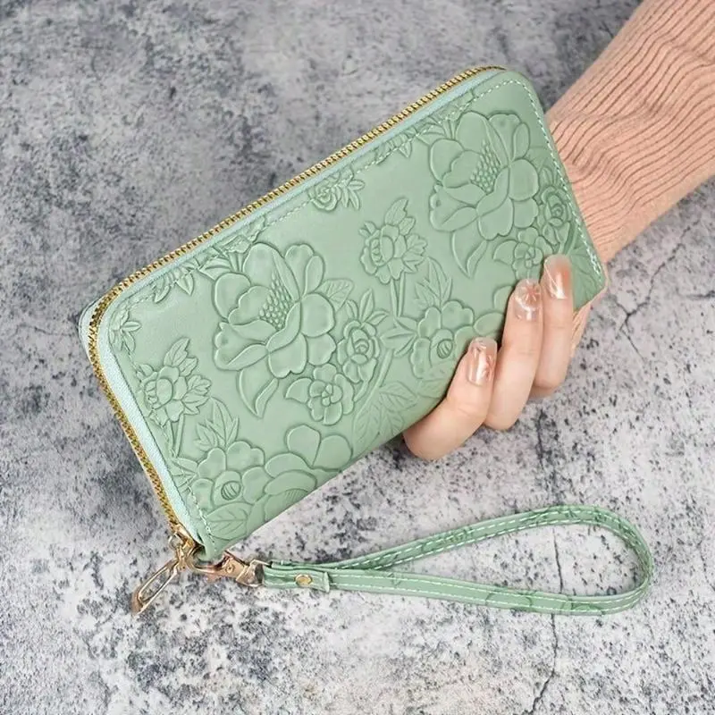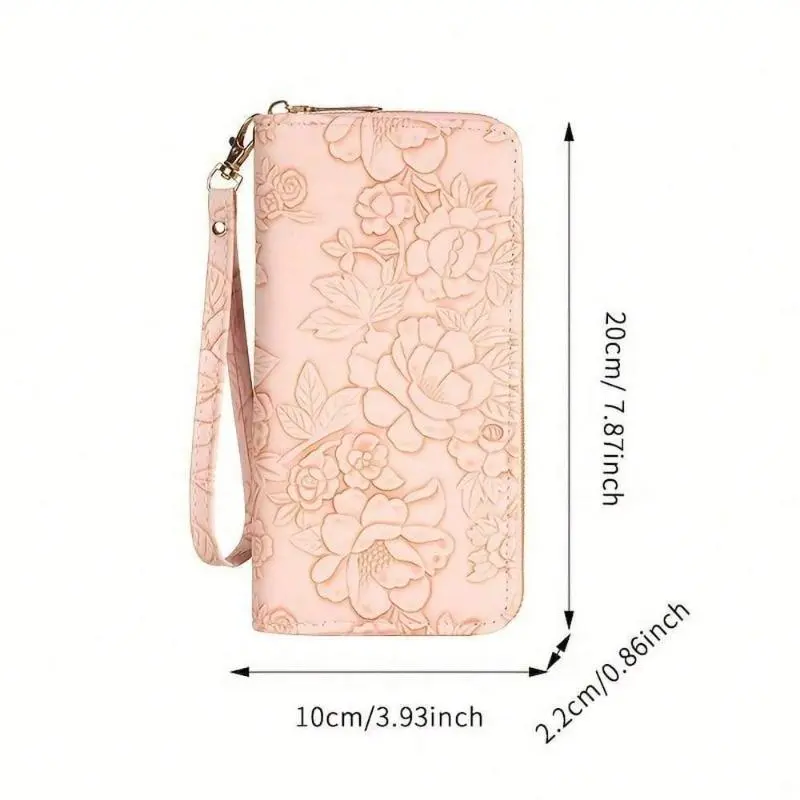 Floral Embossed Faux Leather Wallet for Women, Large Capacity Zippered Clutch with Card Slots, Phone Pocket & Wrist Strap, Coin Purse for Daily Use, Shopping, Dating & Ideal Gift for Her