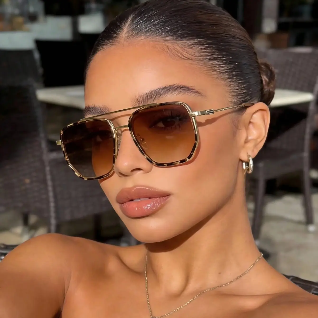 Sleek Double-Bridge Aviator Sunglasses - Textured Metal Frame with Angular Lenses, UV400 Protection Shades Perfect for Everyday Casual and Timeless Street Style