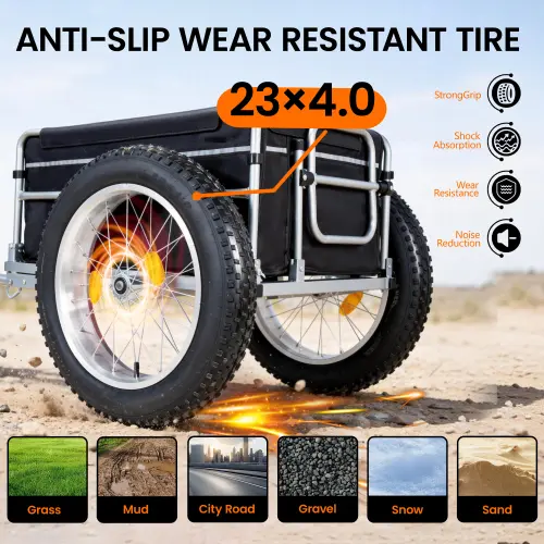 Featuring premium 23"×4.0" pneumatic fat tires, this trailer offers excellent traction, shock absorption, and balance. It handles gravel, grass, dirt, pavement, and rough terrain. Enjoy a smooth, stable ride even under heavy loads. Perfect for any adventure.