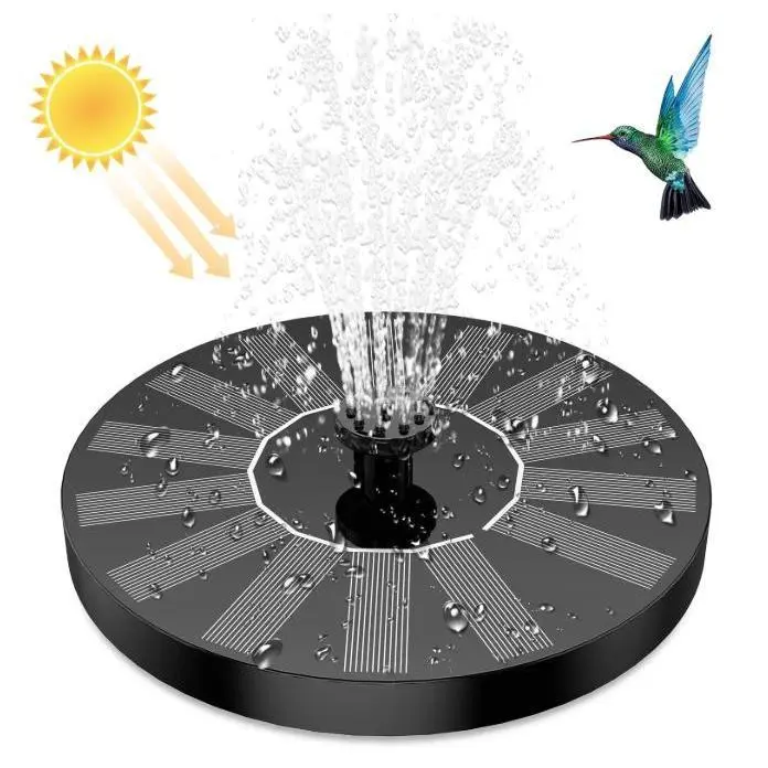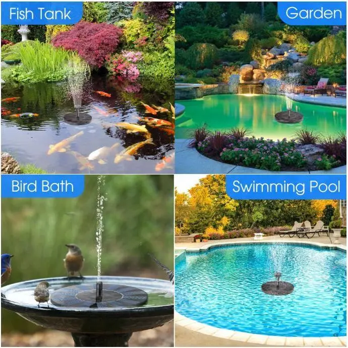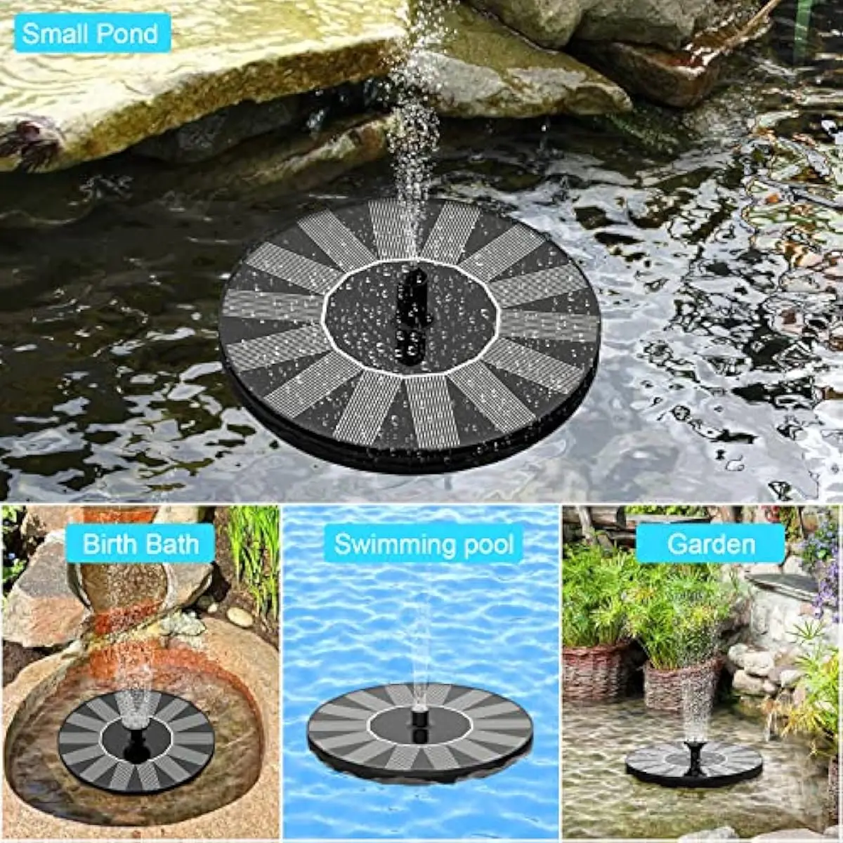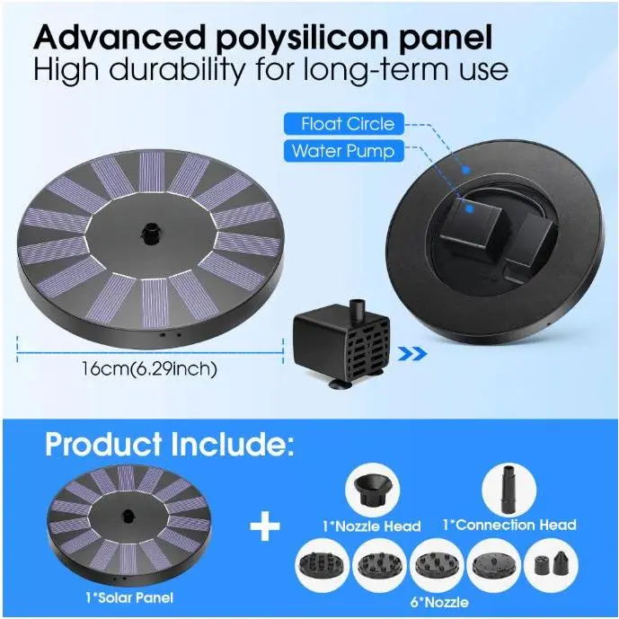 Product descriptionSolar Fountain PumpThe solar fountain comes with 6 replaceable accessories, allowing you to enjoy the beauty of the fountain on sunny and leisurely days.landscape decoration