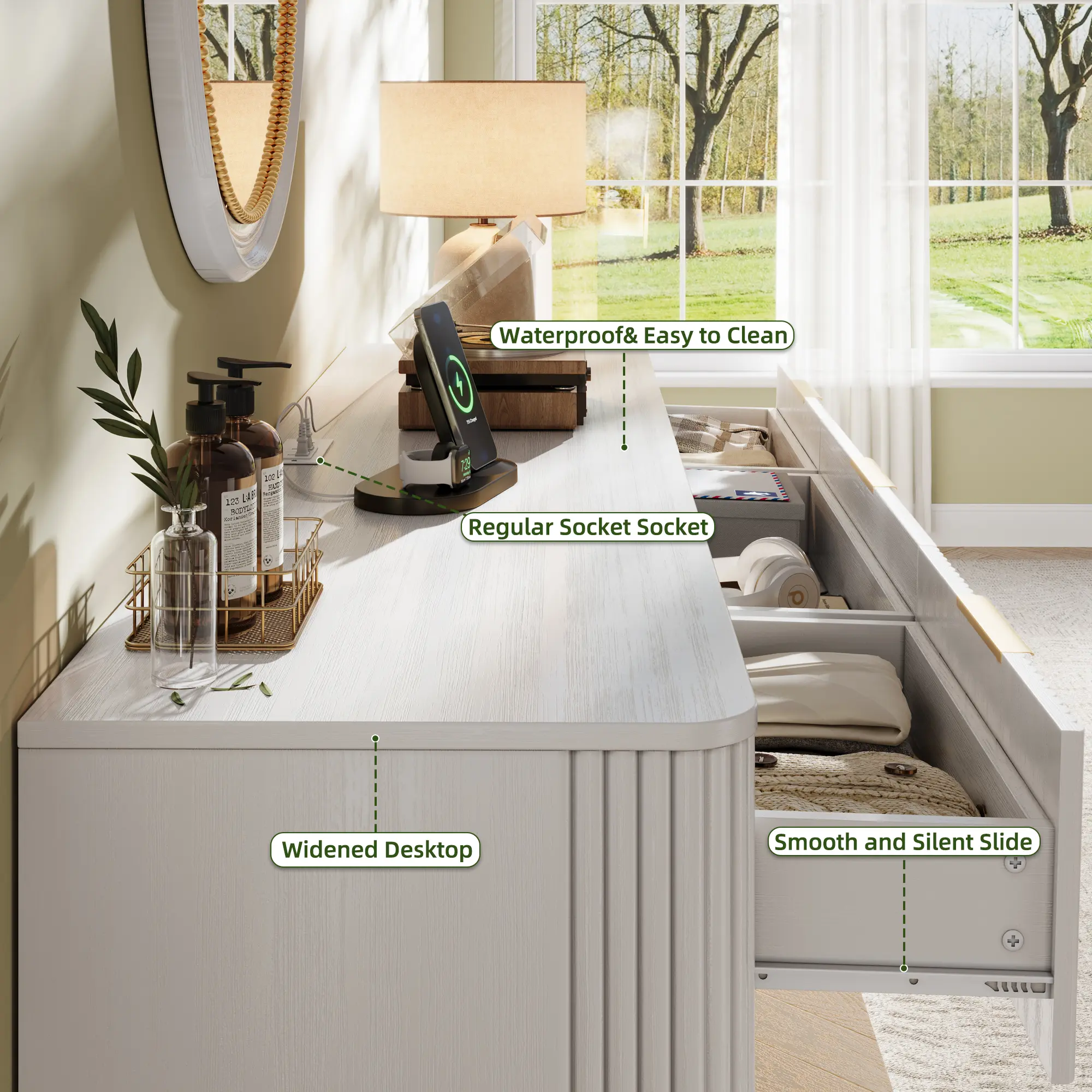 【User-Friendly Design】Each drawer of the dresser is pre-installed with smooth metal slides, ensuring that the drawers open or close smoothly and easily every time.Even when used with excessive force,the slides remain undamaged,protecting the furniture. The larger drawers are designed with two round handles, facilitating easy operation and use.