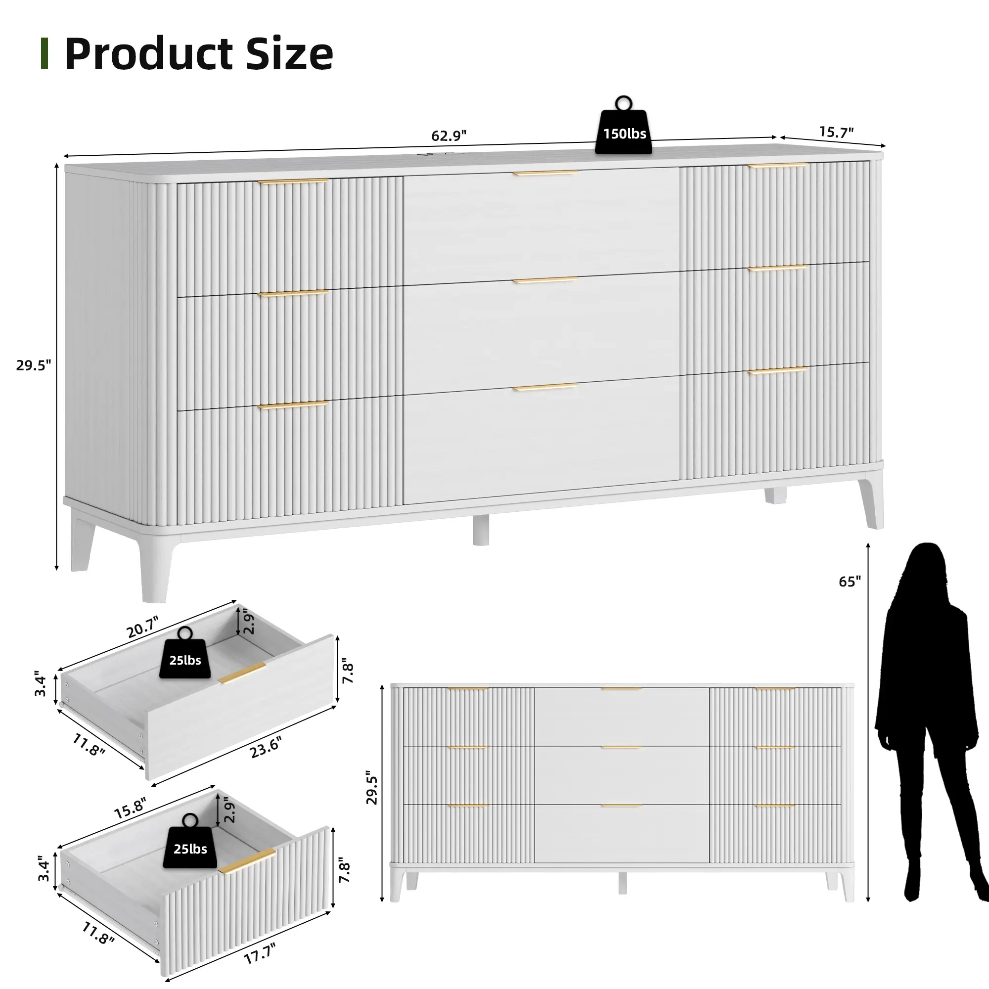 【Multifunctional Wood Dresser】 With dimensions of 62.9 L x 15.7" W x29.5" H, this dresser offers a variety of options for organization and storage.In a cozy bedroom,this closet dresser can serve as a bedroom closet dresser and an end-of-bed storage cabinet.In a lively living room,it can be transformed into a platform for displaying your belongings,utilizing its smooth surface to showcase home décor or artwork.In your entryway,this 9 drawer dresser serves as an elegant storage solution,keeping your space tidy and chic.