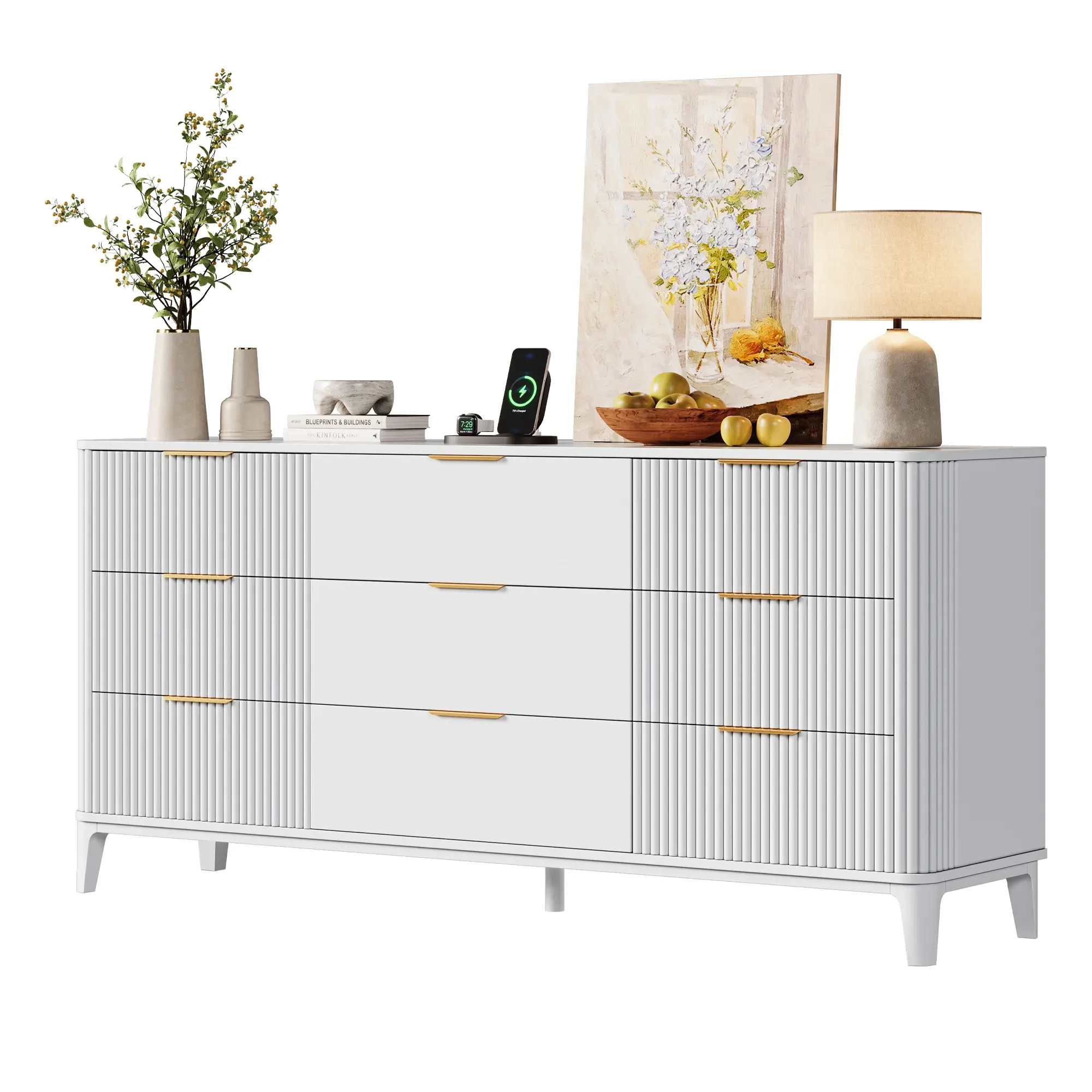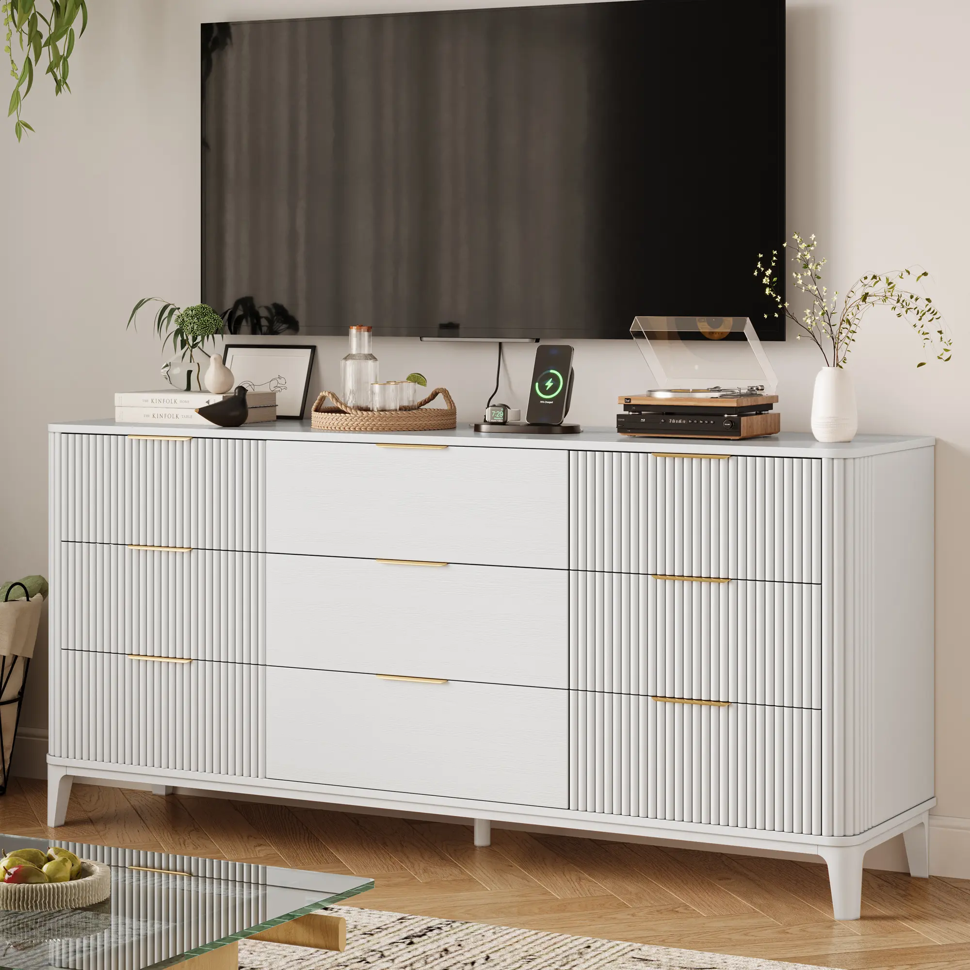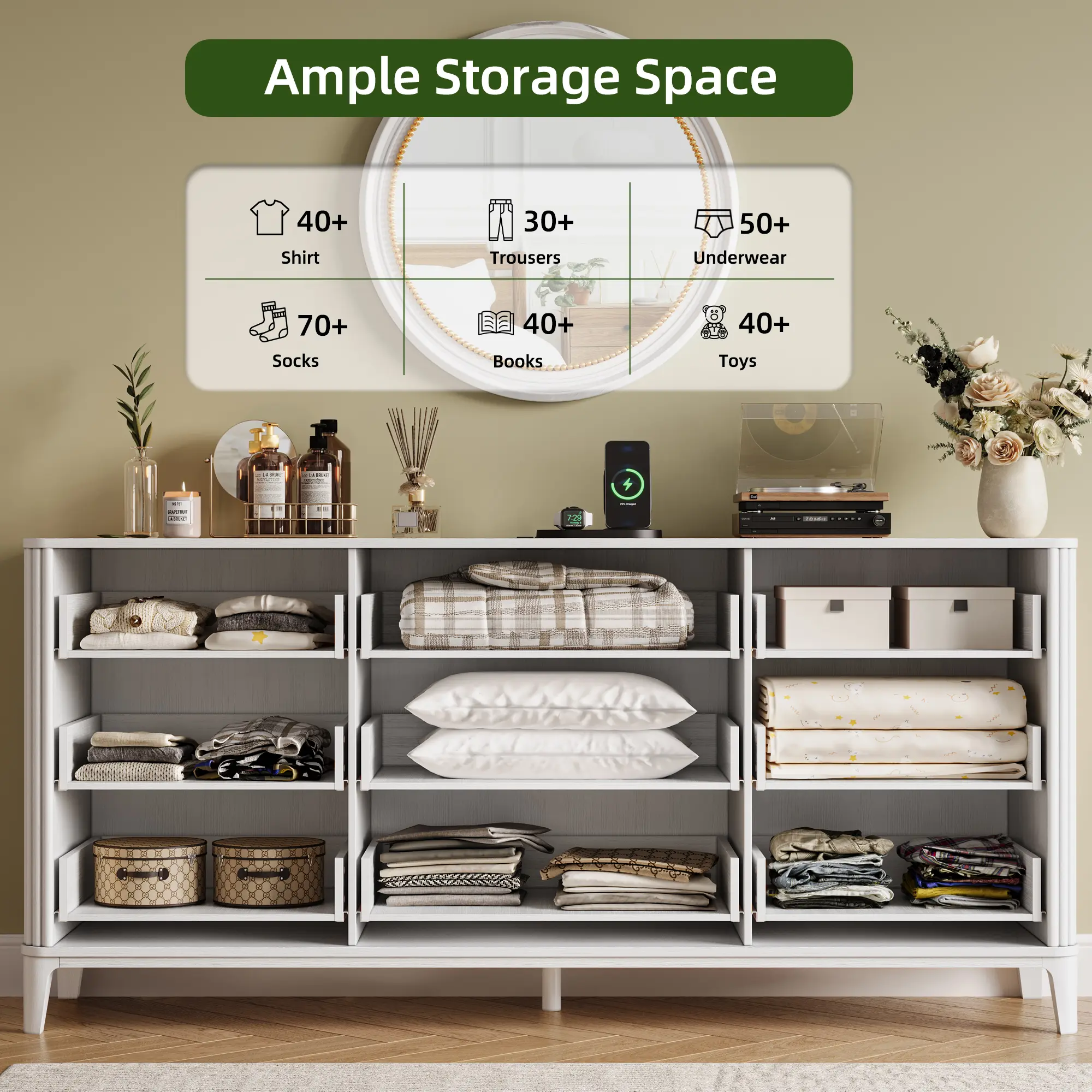 【Spacious Countertop】Featuring a spacious 62.9''x29.5'' tabletop,this long dresser provides you with more space to display precious photos,artwork and decorations,making your room a charming gallery.Additionally,the 9 drawer dresser can be placed in a living room to serve as a TV stand.