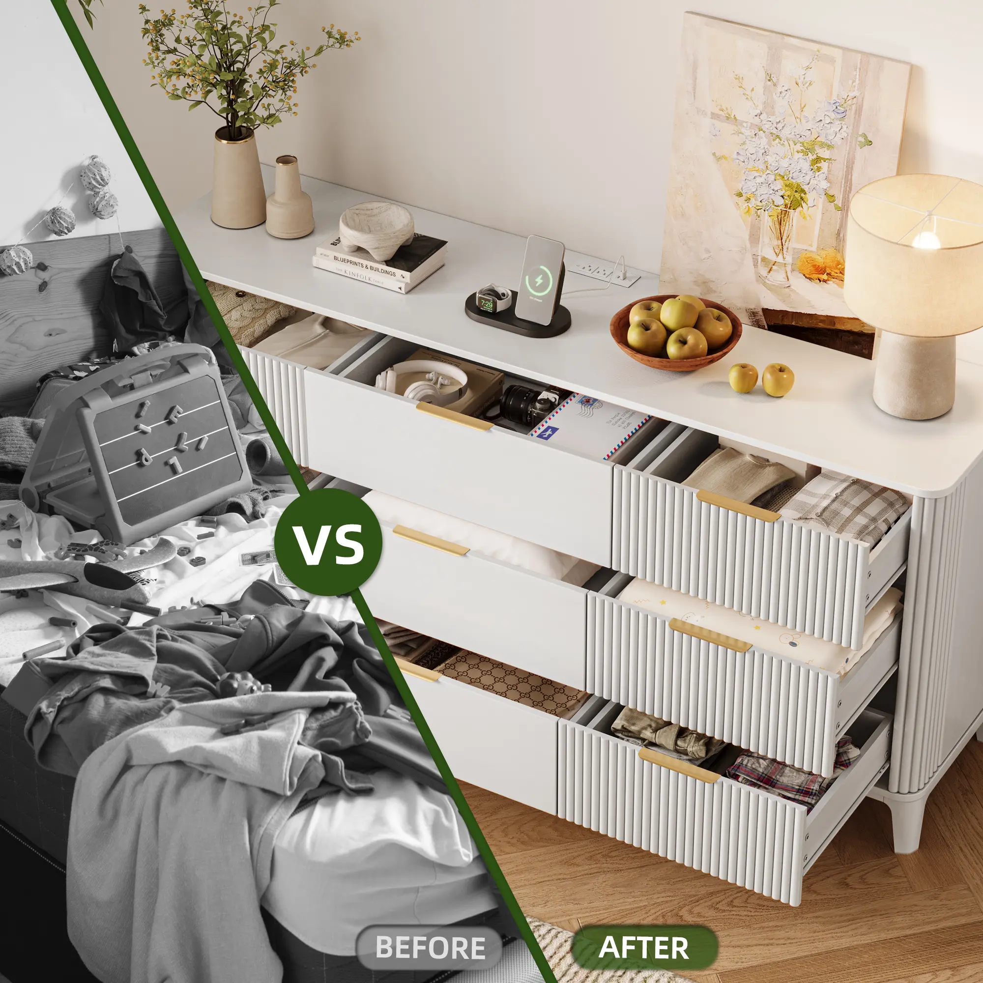 【Ample Storage Space】Our white bedroom dresser features a 3-tier design with 9 large drawers,providing ample storage space to accommodate your diverse storage needs.The smaller drawers are ideal for storing delicate items such as perfume or cosmetics.The larger, deeper drawers are perfect for books,clothes, bedding, blankets,toys,decorations,etc.The larger,shallower drawers are well-suited for storing smaller items such as socks,ties, and other accessories.