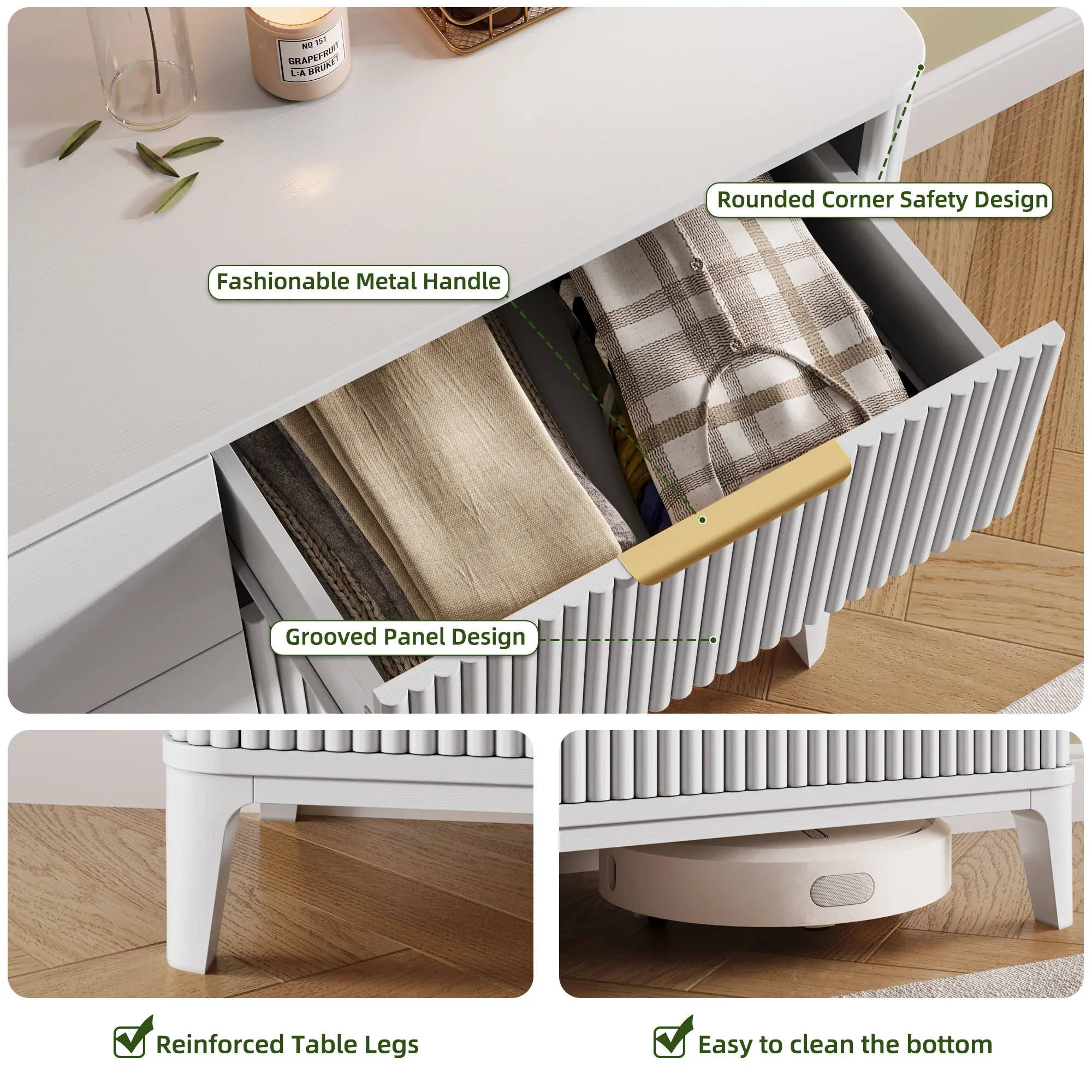 【Sturdy and Stable】Our chest of drawers is constructed from MDF, a material that offers long-term durability and resistance to scratching.The 6 delicate solid wood legs at the bottom serve to ensure both the strong stability and safety of the wood dresser dresser,while also preventing moisture from reaching the wood itself by separating it from the floor.