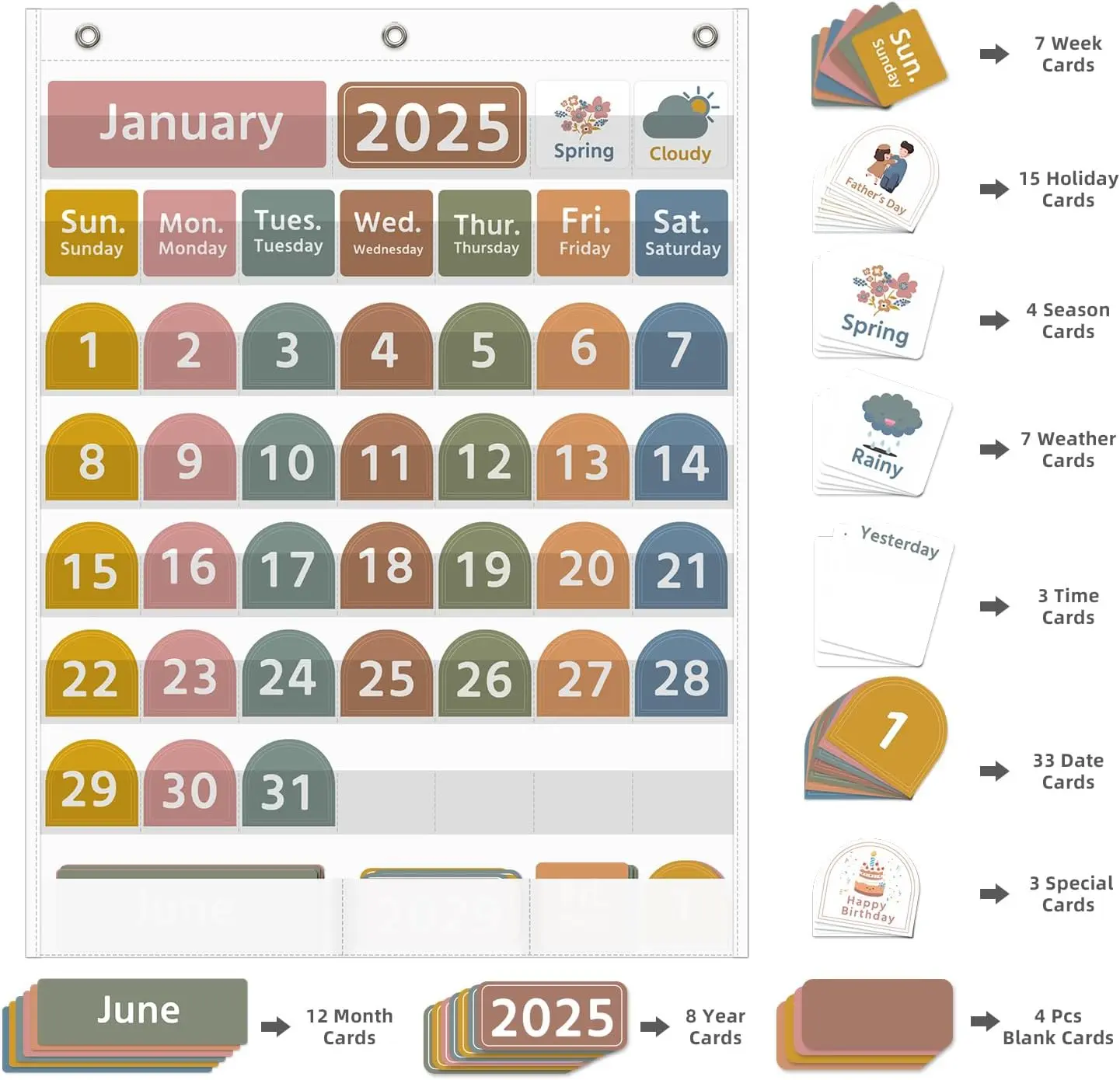 【You Will Get】1 piece of large white calendar pocket chart, 96 pcs boho cards in total (including 8 pcs year cards,12 pcs month cards, 7 pcs weekday cards, 7 pcs weather cards, 33 pcs date cards, 15 pcs holiday cards,4 pcs season cards, 3 time cards,4 blank cards,3 pcs special date cards). it's easy to build their own schedule.