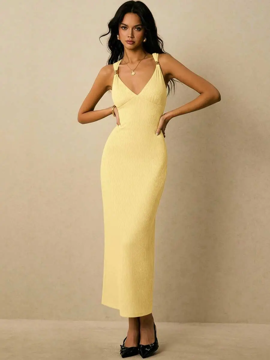 IYUNA Women's Solid Color Sweetheart Neck Fitted Elegant Sleeveless Dress