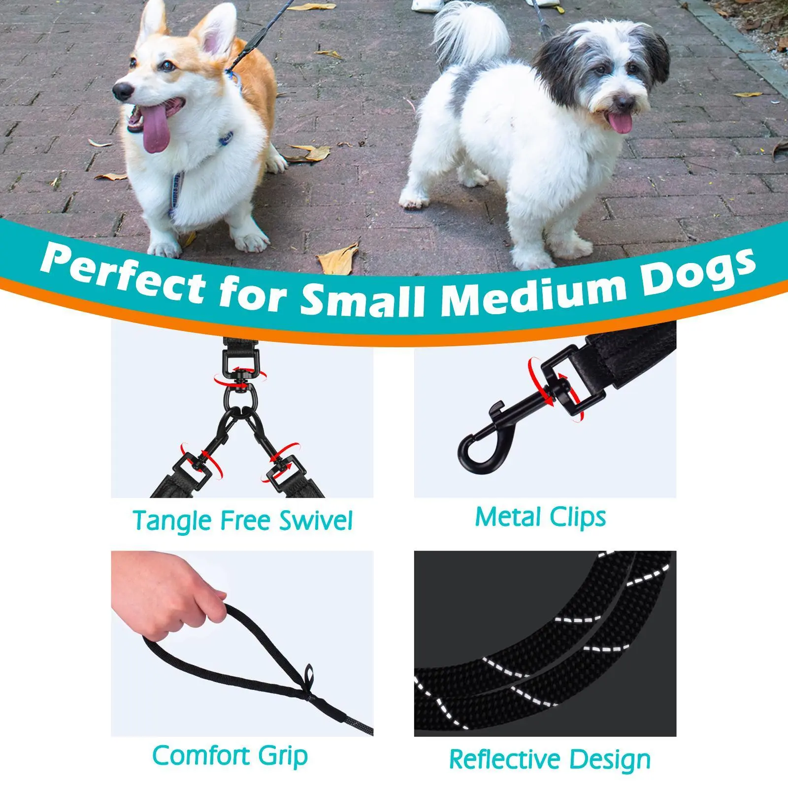 No Tangle Two Dog Leash: The 360 degrees swivel clip help to keep your dogs from getting tangled together. No need to worry about getting twisted two dog leash when dogs switch sides