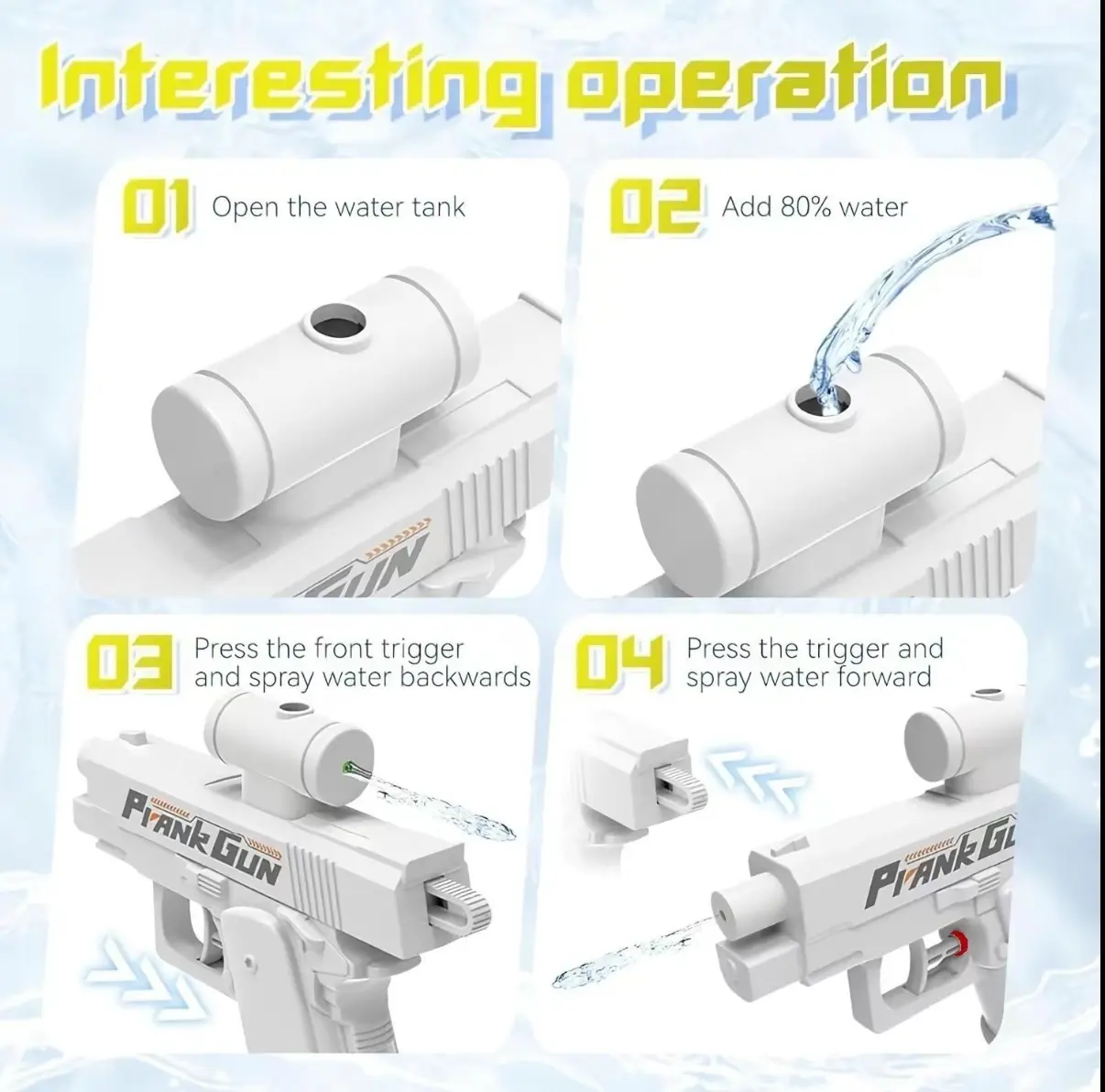 [Dual-sided Feature】 : The unique dual-sided design allowsfor enhanced play, providing more interactive fun comparedto traditional water guns.