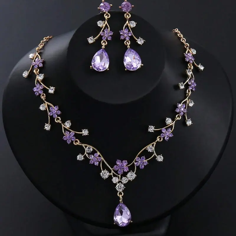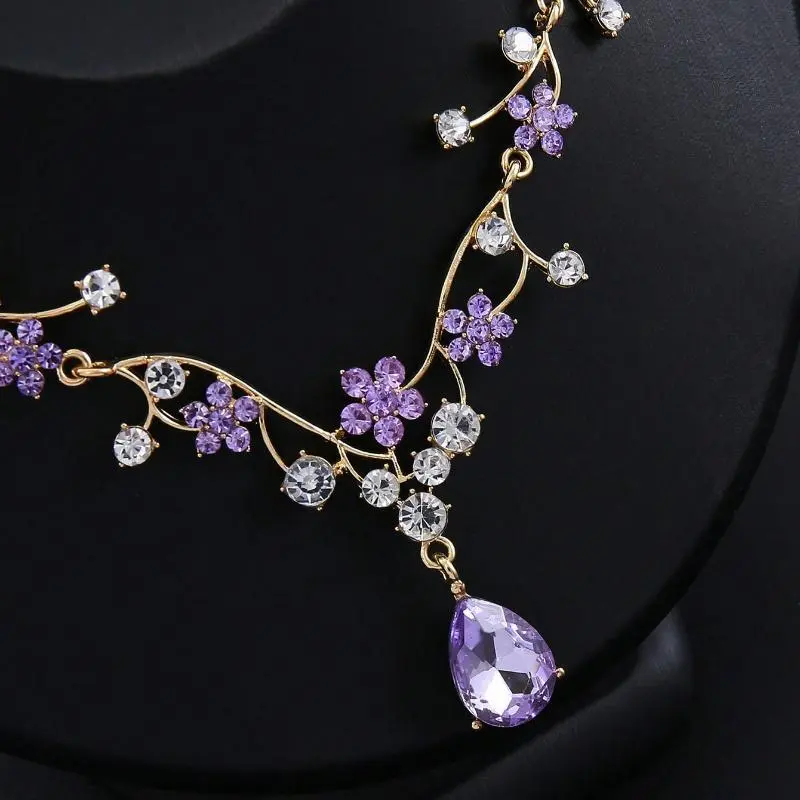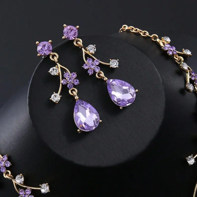 The set is designed for special occasions. It enhances any outfit with its vintage charm. The purple rhinestones add a touch of glamour. Suitable for bridesmaids and brides. It's a precious jewelry piece for weddings and holidays.