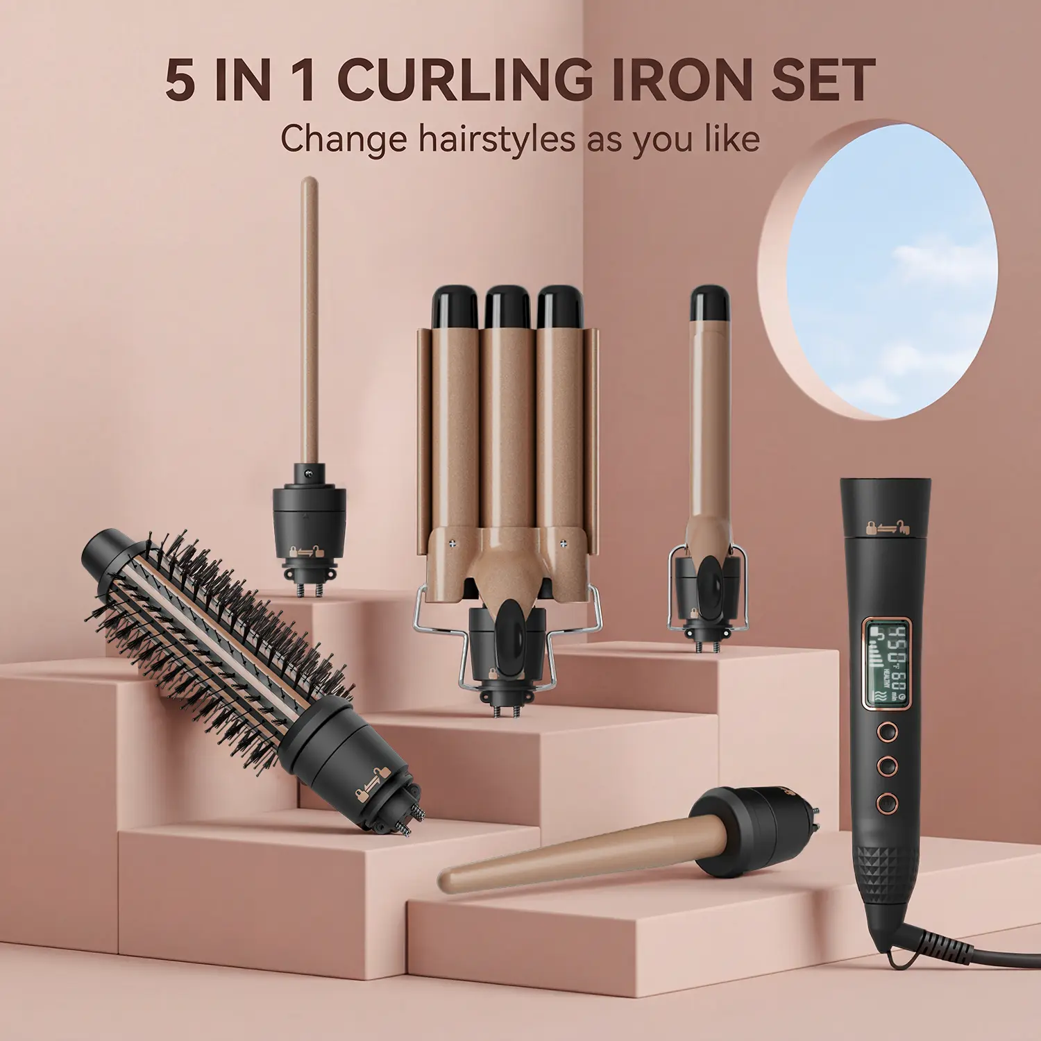 Versatile Curling Iron Set: curling iron set offers versatile styling options and tailor your look with five precision barrels, including a 0.35-0.71 inch tapered barrel, 0.5 inch curl barrel with clip, 1 inch curling wand, 1.25 inch curl barrel with clip, and a specialized hair straightener for styling flexibility.Whether you're straightening or curling, long hair or short hair, this all-in-one set has you covered