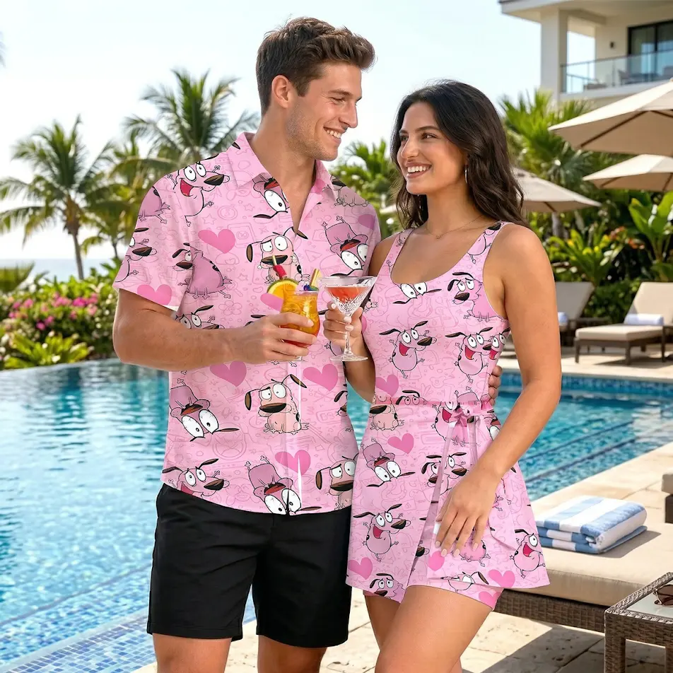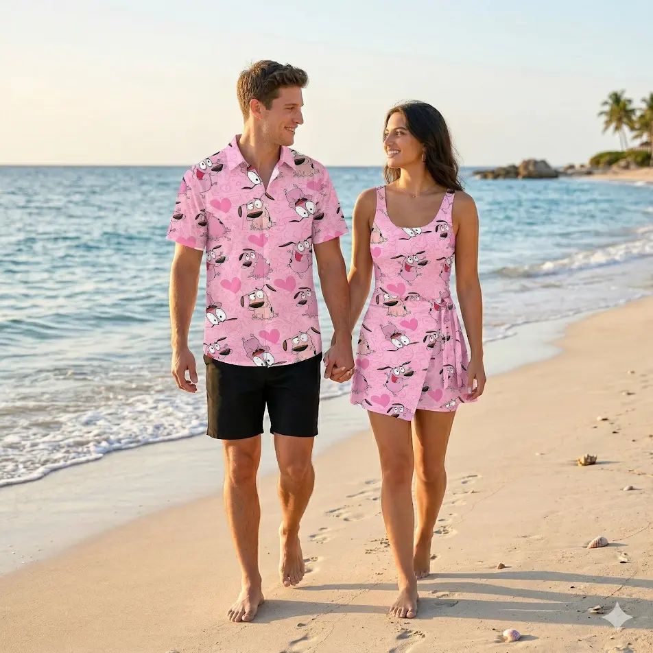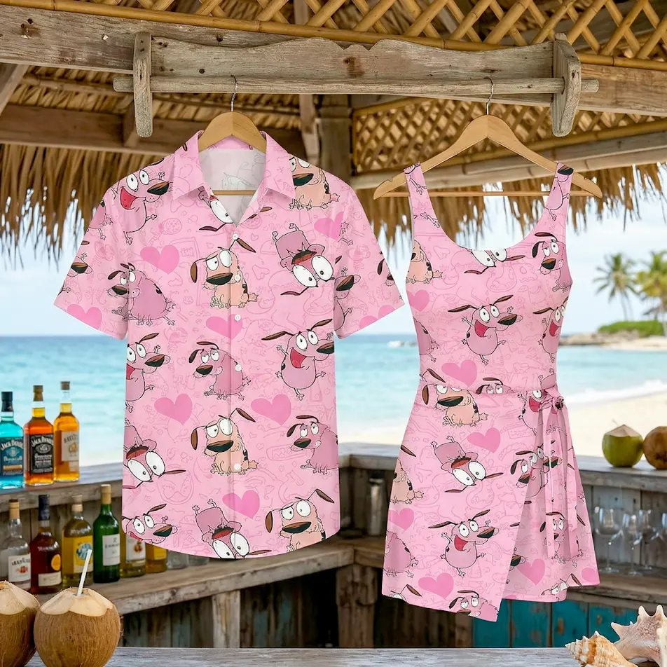 Courage The Cowardly Dog Pink Pattern 2026 Vacation Couple Set Dress and Shirt Hawaii, Retro Cartoon Fan Apparel, Summer Outfit | 300326.R3032.ID00