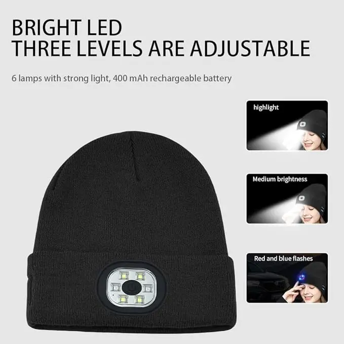 ·[USB Rechargeable] : Equipped with a built-in light, this headlamp beanie features a standard USB port for convenient battery charging. You can easily charge the beanie hat with light using a car charger, computer, or portable power bank. Once fully charged, the winter hat with light provides up to 6 hours of continuous lighting, with a quick charging time of around 2 hours.