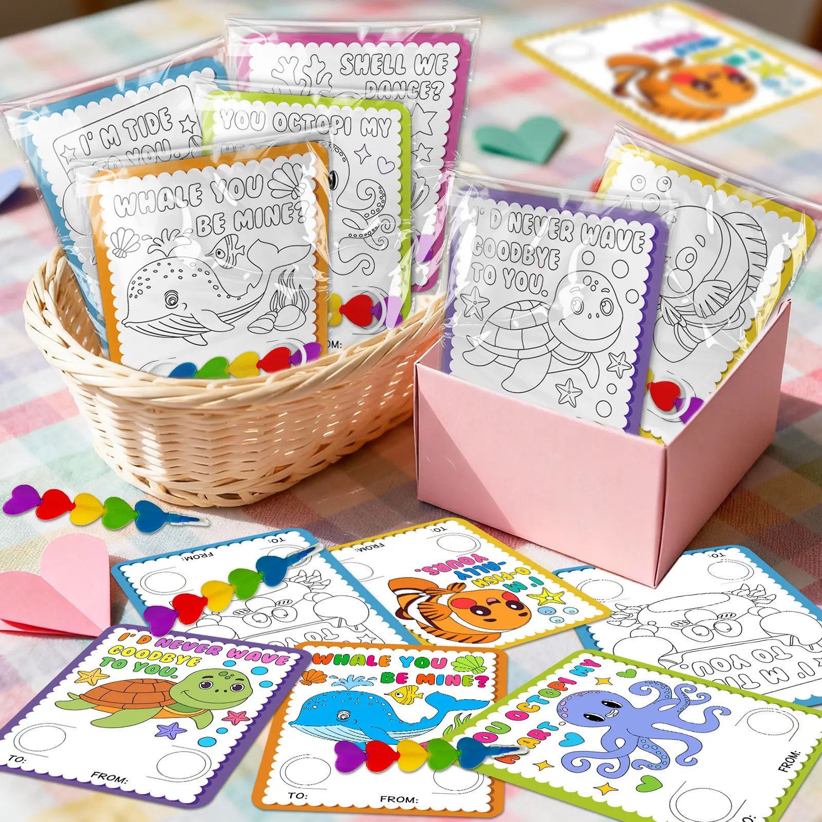 24Pcs Marine Animals Coloring Cards With 24 Stacking Crayons Set, Kids Coloring Cardstock for Home Doodle, Party Favors, Goodie Bags, Classroom Prizes, Birthday Gifts, School Exchange Gifts