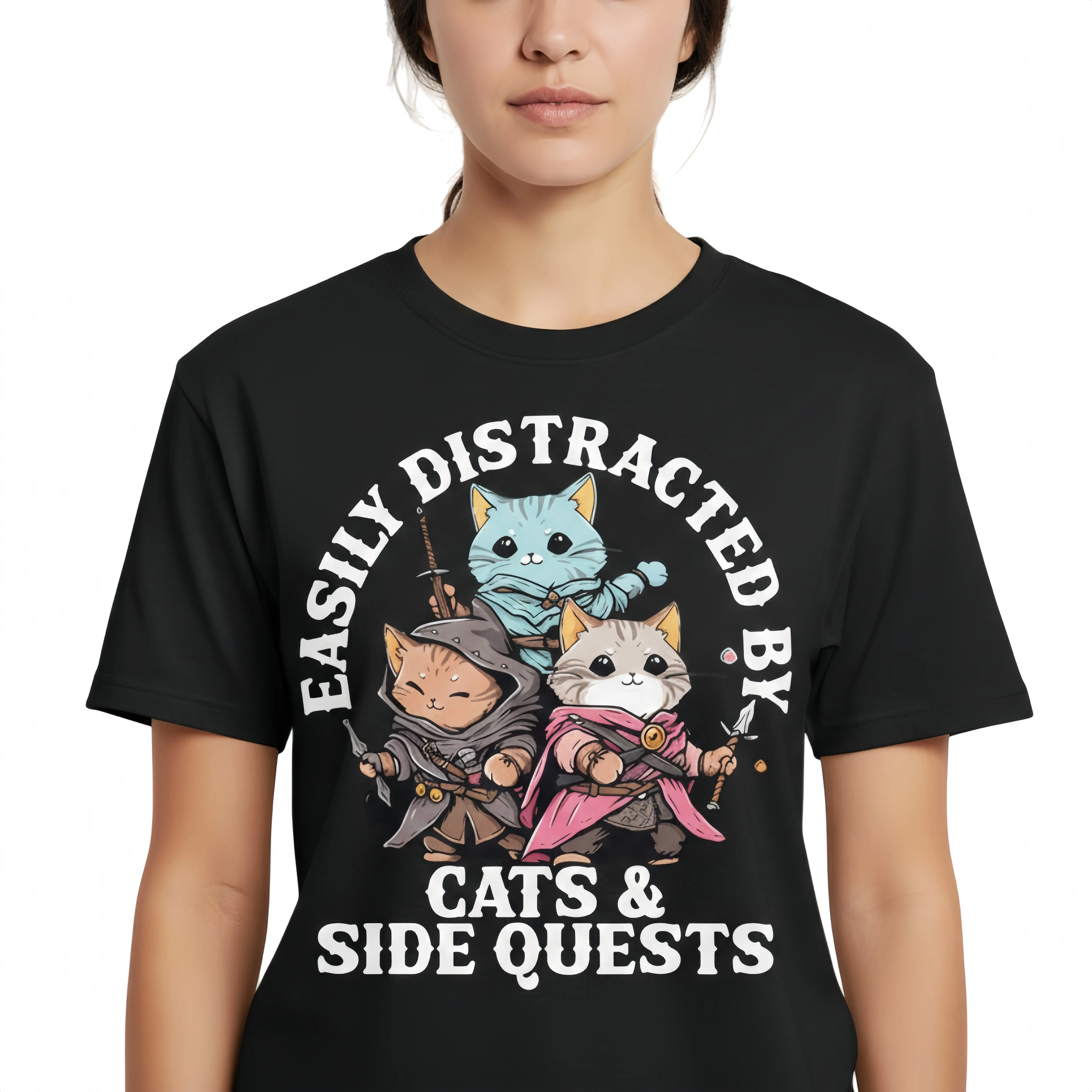 Easily Distracted by Cats and Side Quests T-Shirt Funny RPG Gamer Graphic Tee DND Lovers Gift Retro Fantasy Adventure Cat Apparel Unisex Soft Cotton Gaming Shirt Harajuku Streetwear Top Black