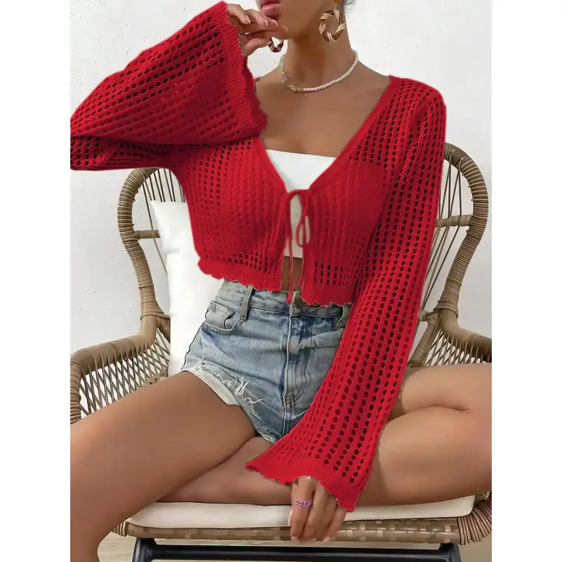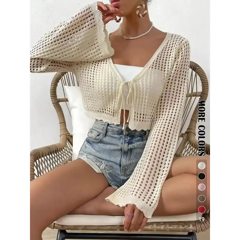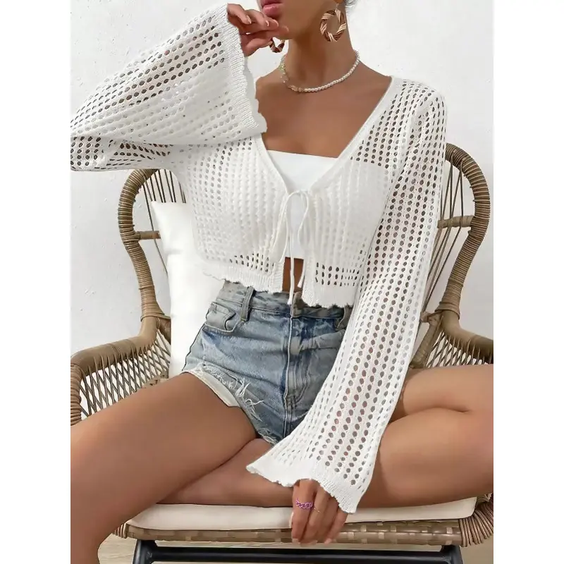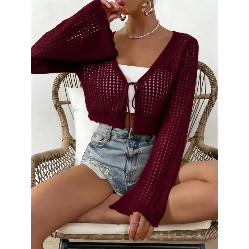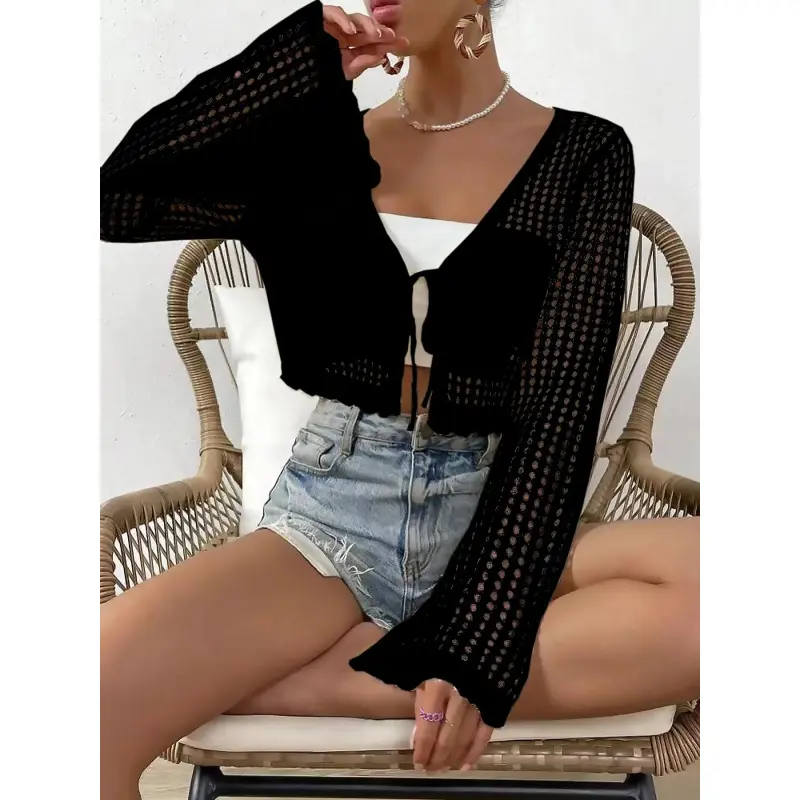 5. Women's Plain Hollow Out Tie Front Crop Cardigan, Casual Flounce Sleeve V Neck Cover-Up Knitwear for Spring, Summer & Fall, Women's Knit Clothing for Daily Wear