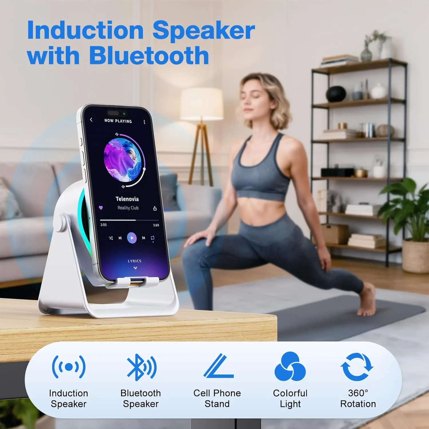 ·Induction Bluetooth Speaker: The wireless induction speaker with induction mode and bluetooth mode. Built-in induction sensor breakthrough bluetooth connection, playing music instantly by placing your phone correctly on the cellphone stand. The bluetooth mode with latest bluetooth 5.3 technology, faster transmission, stable signal and no delay.(CAN NOT WIRELESS CHARGING THE PHONES)