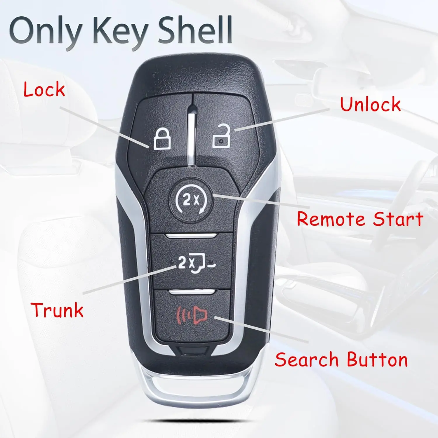 This key fob shell case cover replacement fits Ford F150, F250, F350, F450, F550 trucks from 2015-2017. It also fits Ford Mustang, Fusion, Edge, Explorer, and Lincoln models. The cover includes an uncut key blade blank. Ideal for keyless entry remote control with 5 button pads.