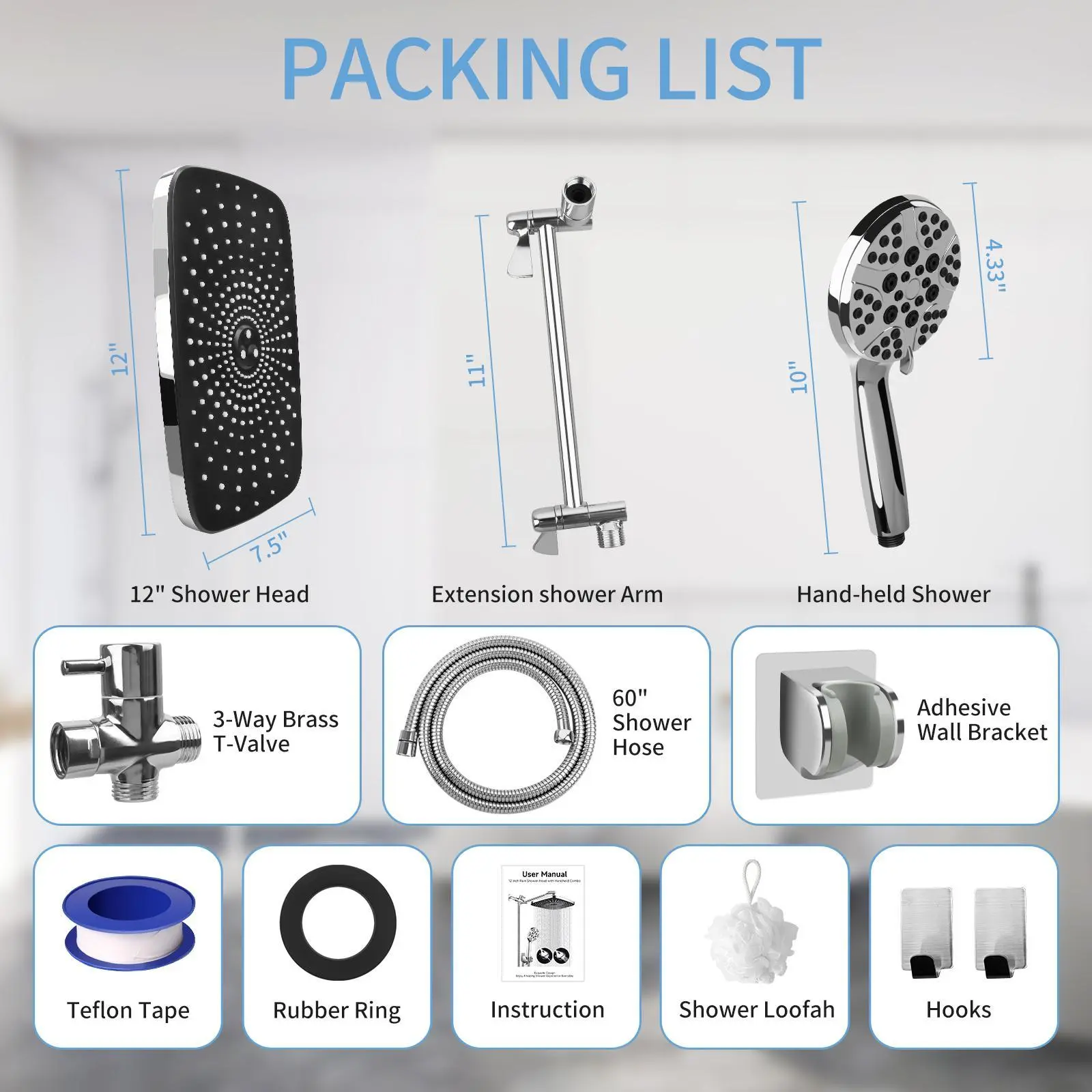 PHANCIR 12" Rain Shower Head, High-Pressure, Adjustable Arm, Anti-Clog, Handheld & Wall-Mounted, 3+5+2 Spray Modes