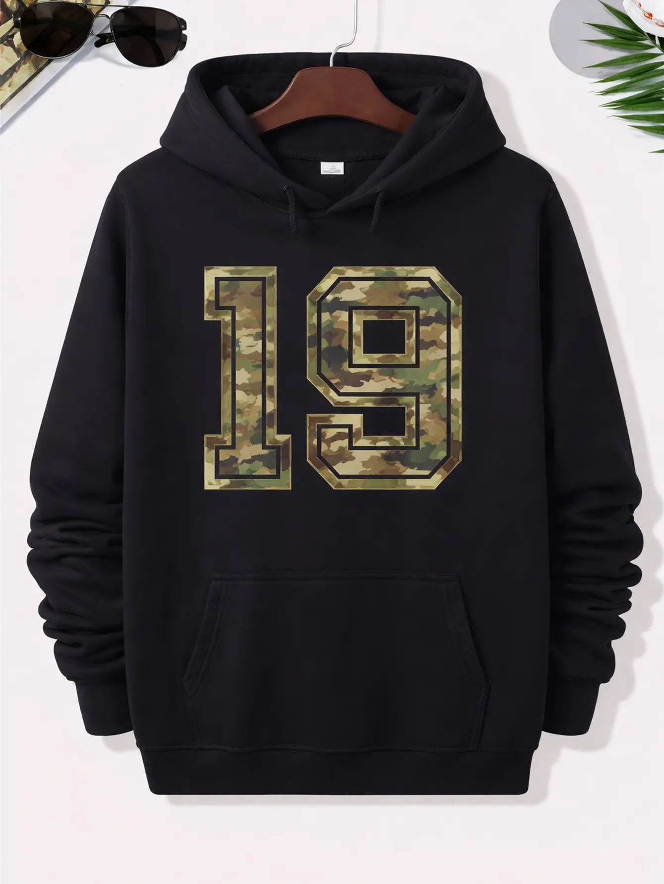 Men's game-themed hoodie featuring a bold number '19' in camouflage design, targeting fitness enthusiasts, athletes, and fans of personalized apparel Graphic Hoodie - Long Sleeve Pullover Regular Fit | Soft & Breathable Fabric, Durable Print, Everyday