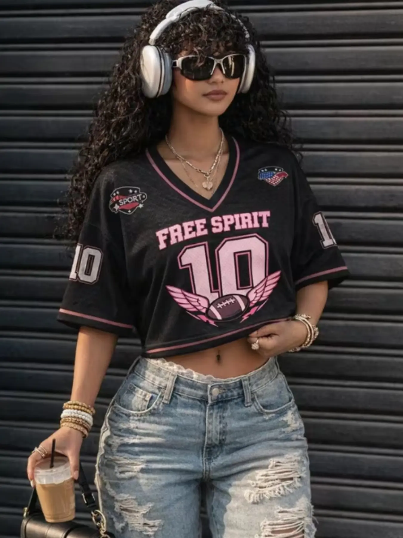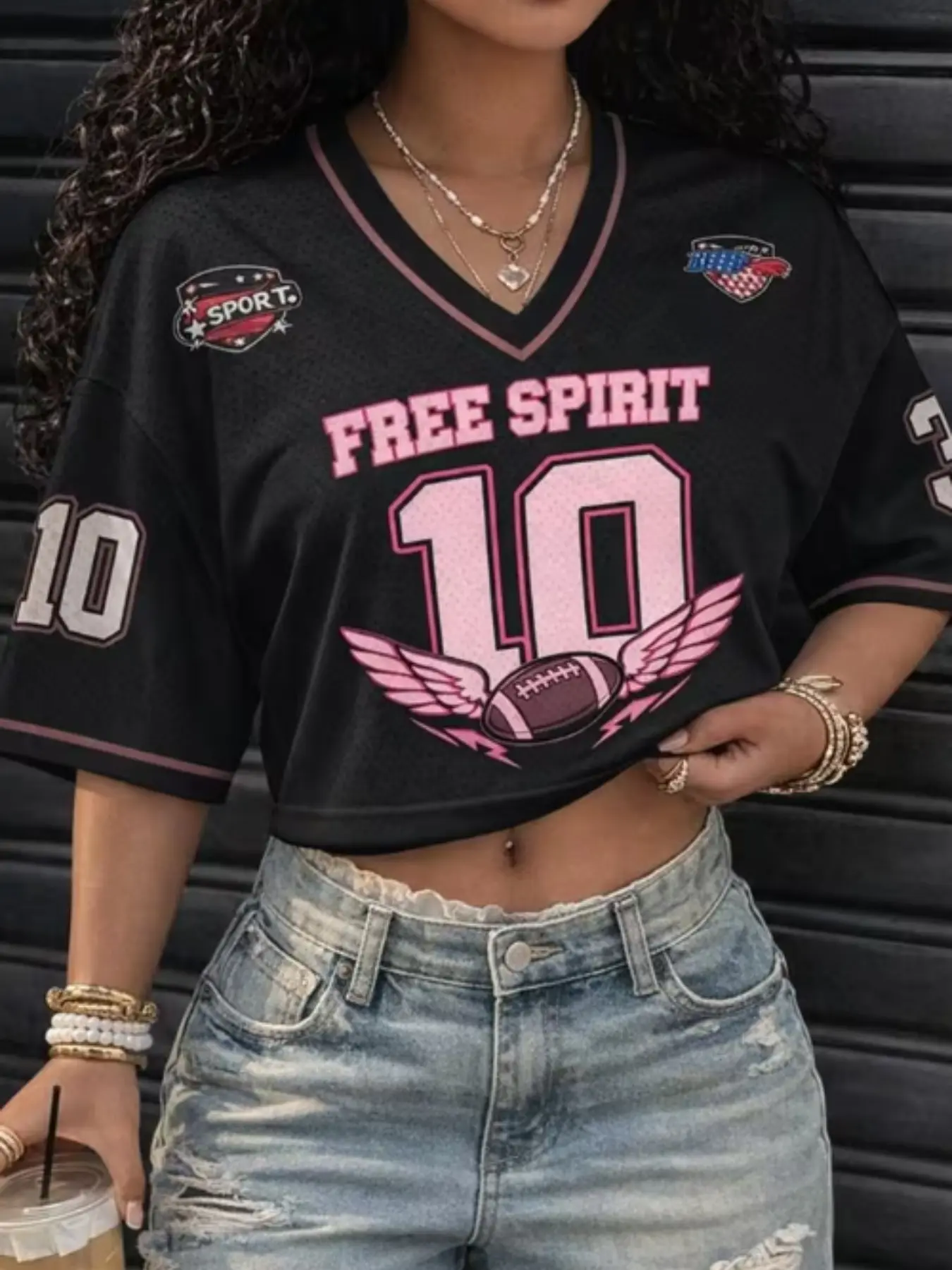 Y2K Free Spirit 10 Rugby Short Sleeve Tee, Colorblock Loose V Neck, Blokecore Streetwear Print Women's T-Shirt
