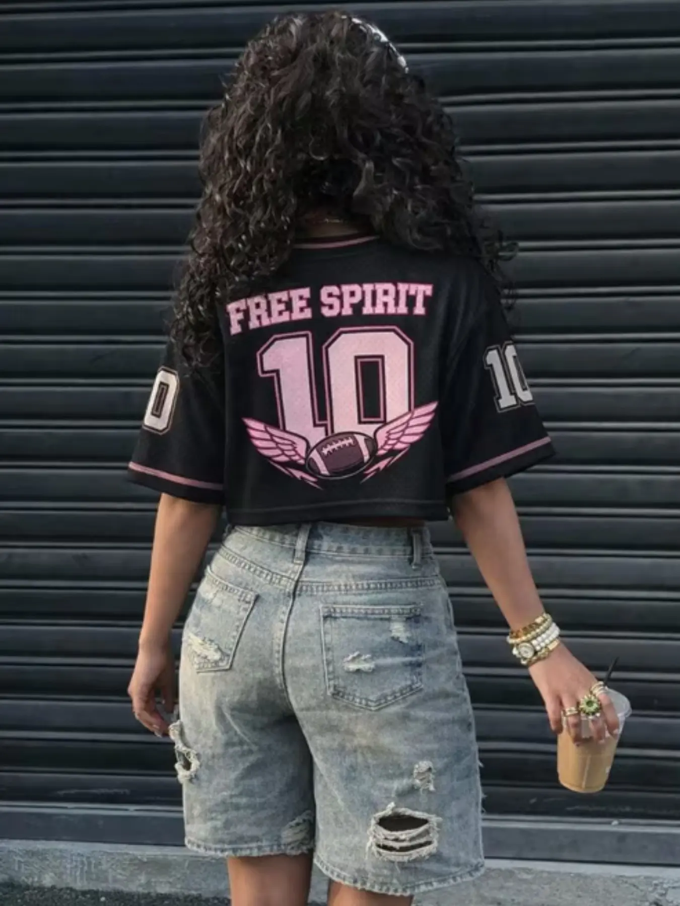 5. Y2K Free Spirit 10 Rugby Short Sleeve Tee, Colorblock Loose V Neck, Blokecore Streetwear Print Women's T-Shirt